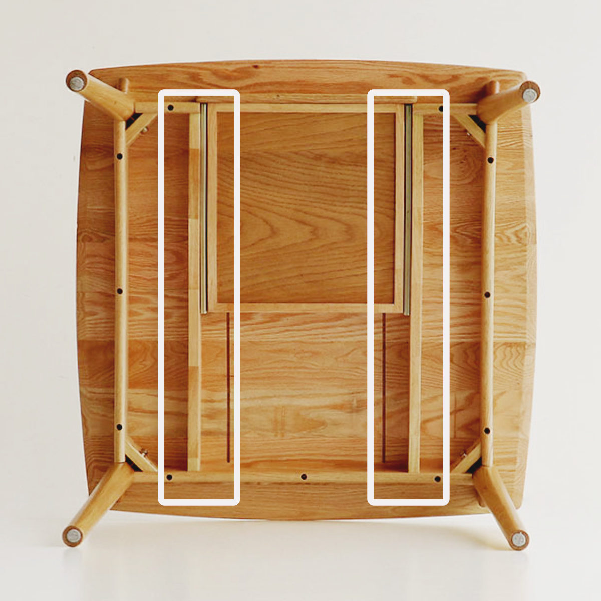 天板の反り対策として、天板裏に2本のスリットが入っています。また、引き出し固定用の桟も、反り止めの役割を果たしています。