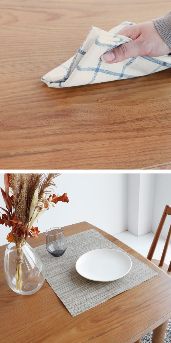 ラッカー塗装を施しているため、日常のお手入れは簡単。乾いた布や軽く絞った柔らかい布で拭くだけで、 美しい状態を保てます。コースターやランチョンマットをご使用いただくと、さらにきれいに長くお使いいただけます。