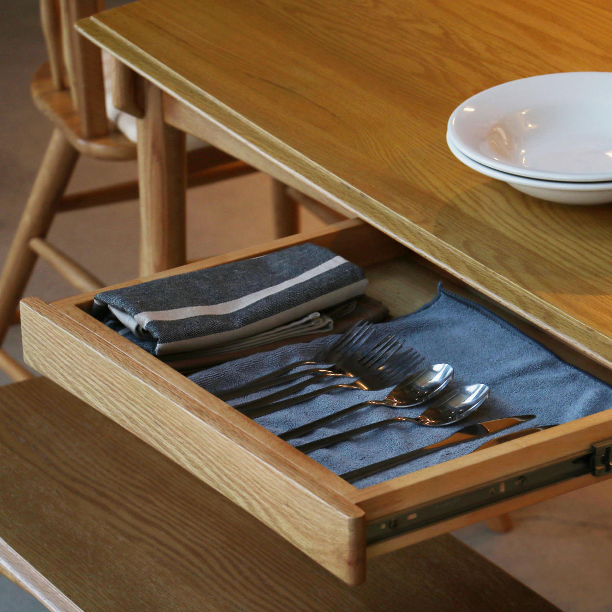 幕板部分には引出しが付いています。カトラリーや新聞など、ダイニングで散らかりがちな小物の収納に便利です。