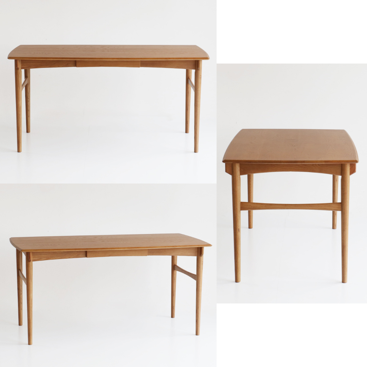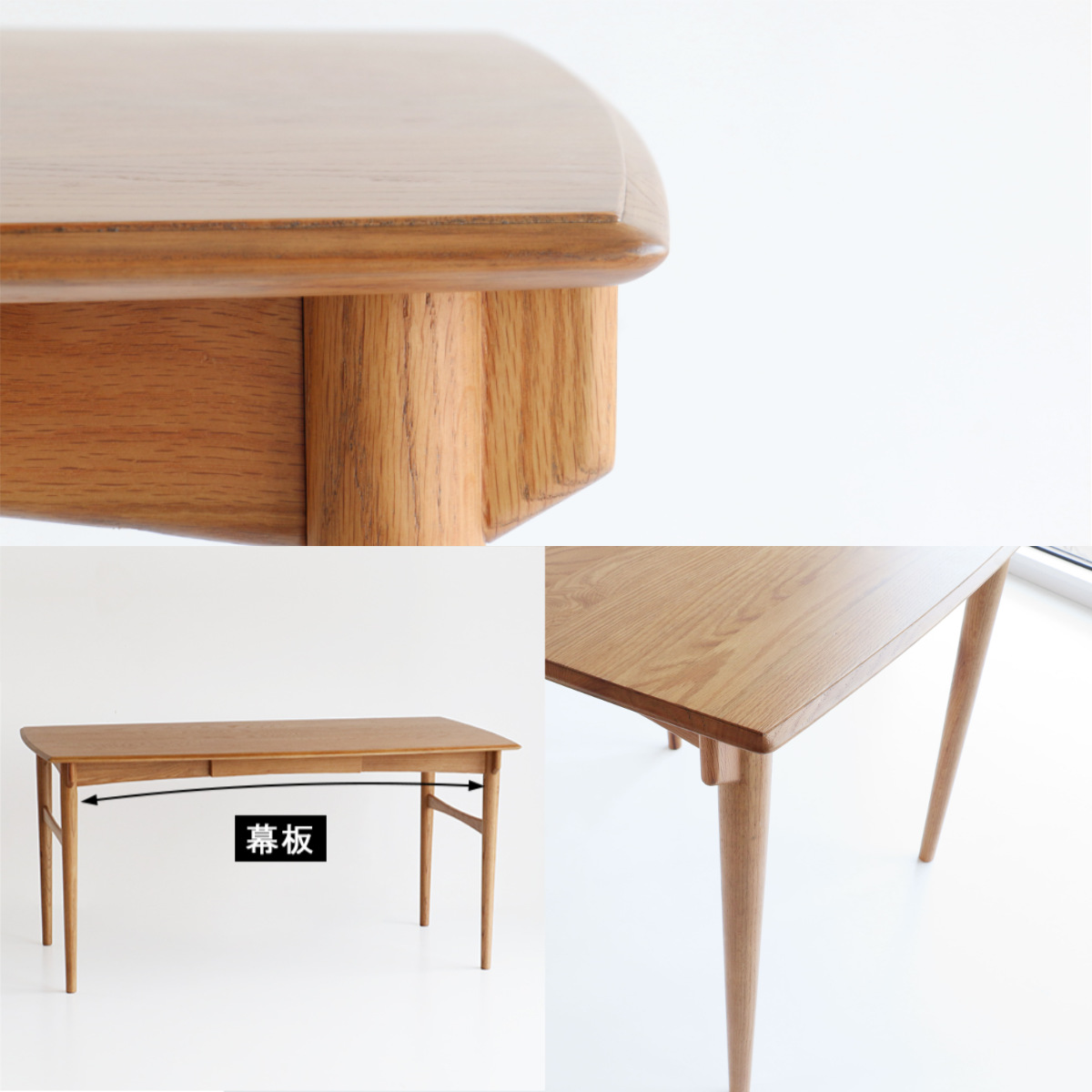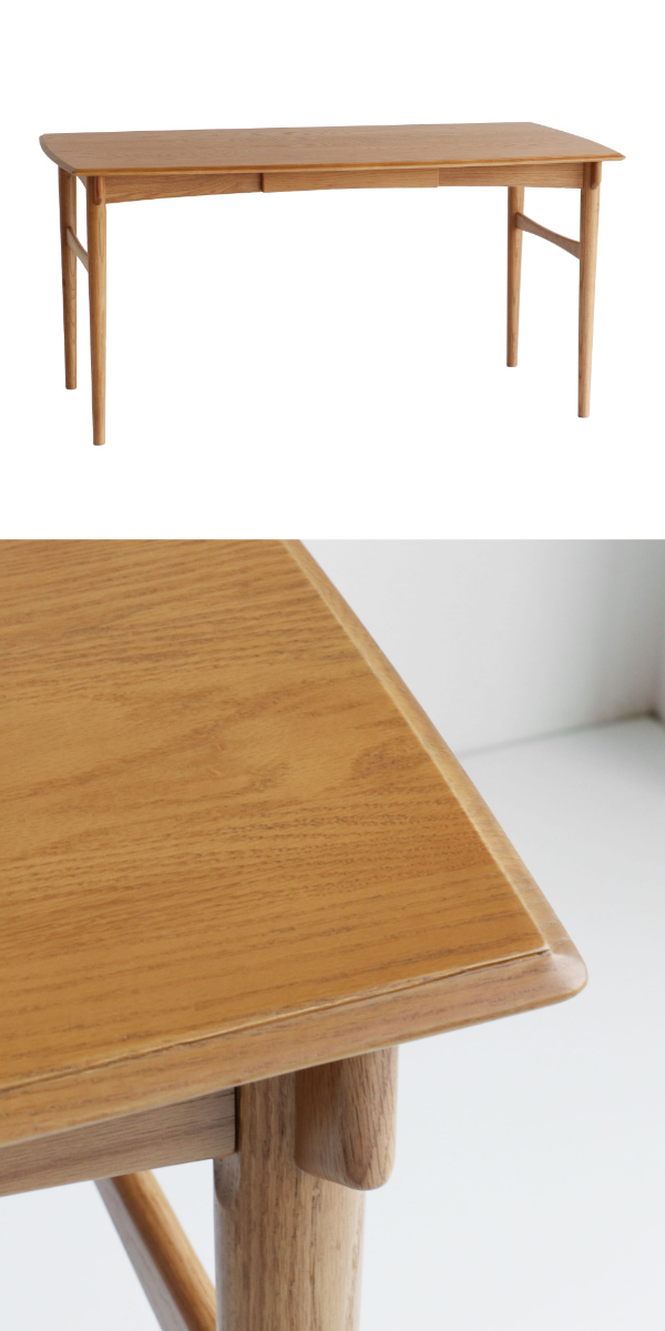 天板小口や脚に丸みを持たせたなめらかなデザインです。幕板にも曲線を取り入れることで、全体的に柔らかく洗練された印象をプラス。天板や脚部の丁寧な仕上げが高級感を演出し、北欧デザインの「機能美」を体現しています。