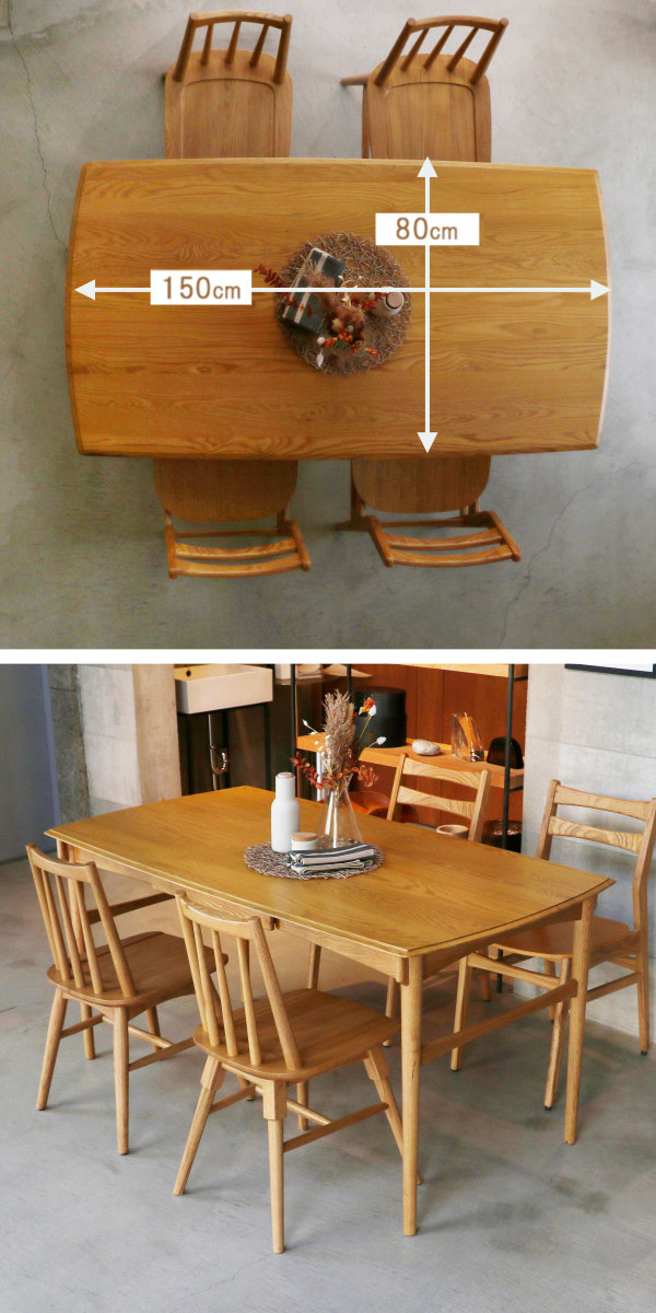 天板サイズは150cm×80cmの長方形で、4人がゆったり座れる余裕のある設計。家族の食卓や来客時にも活躍します。1人あたりの食事スペースは 75cmと広々。鍋料理やパーティー料理を並べても快適に使えます。