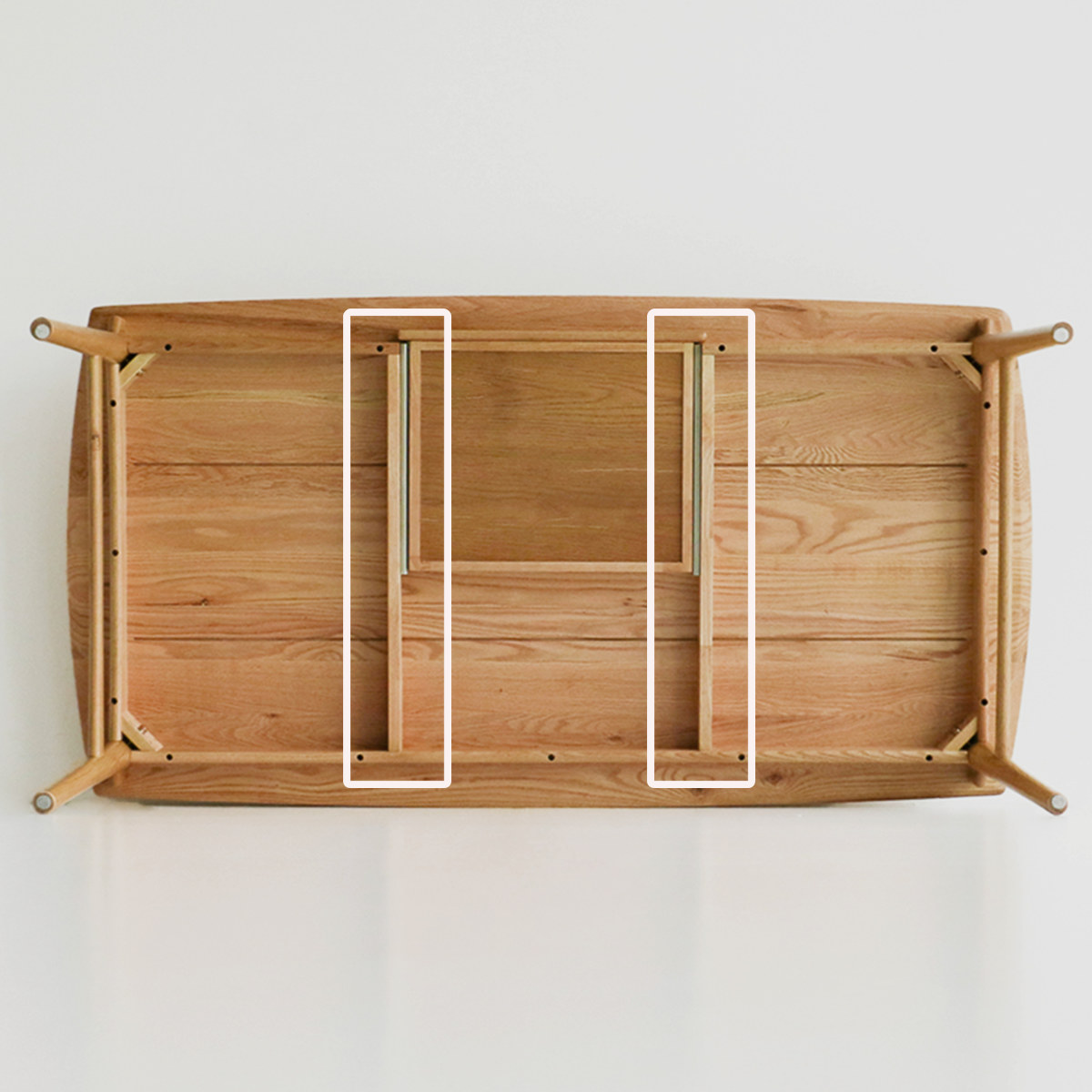 天板の反り対策として、天板裏に2本のスリットが入っています。また、引き出し固定用の桟も、反り止めの役割を果たしています。