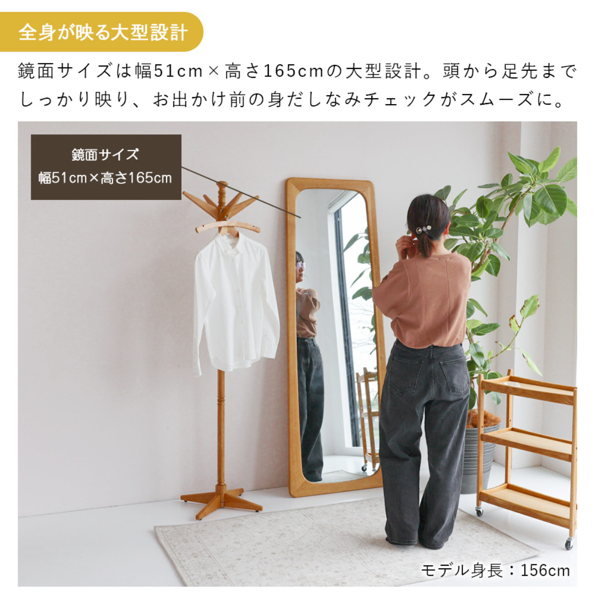 鏡面サイズは幅51cm×高さ165cmの大型設計です。頭から足先までしっかり映り、お出かけ前の身だしなみチェックがスムーズになります。