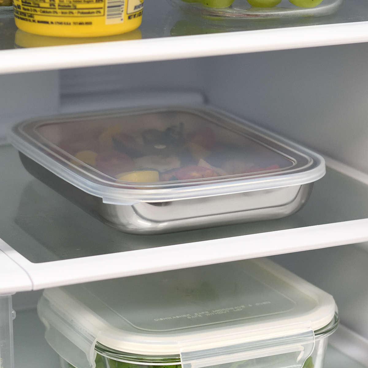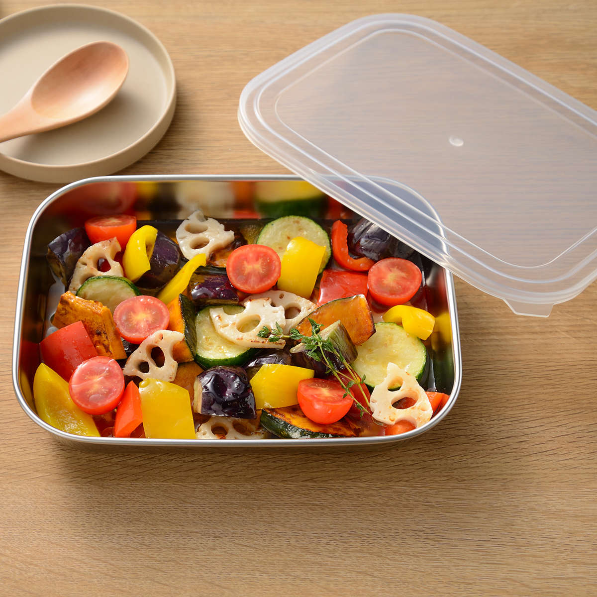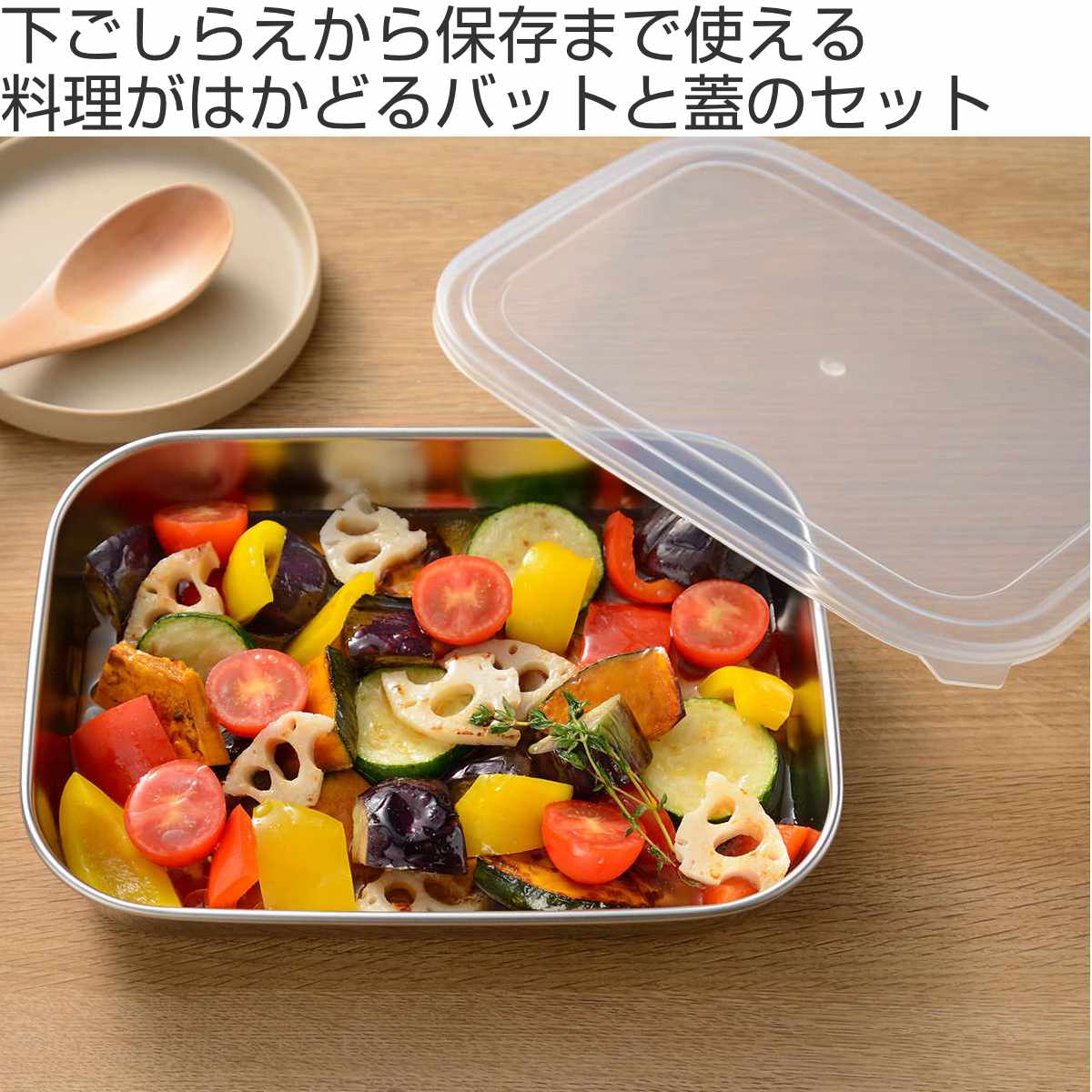 蓋付きで汁がこぼれにくく、におい移りしにくいので冷蔵保存にもおすすめです。浅型のバットなので場所も取らず邪魔になりません。