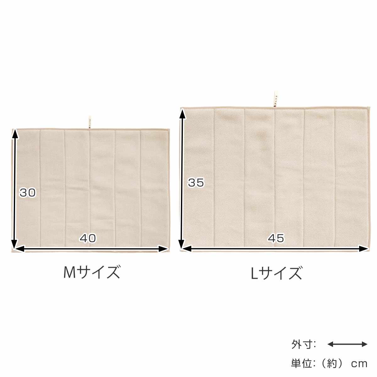 MサイズとLサイズの2種類をご用意しております。大きな鍋もゆったり置けるLサイズ(約35×45cm)、お茶碗から小皿まで食後の洗いものにちょうどいいMサイズ(約30×40cm)の2サイズです。