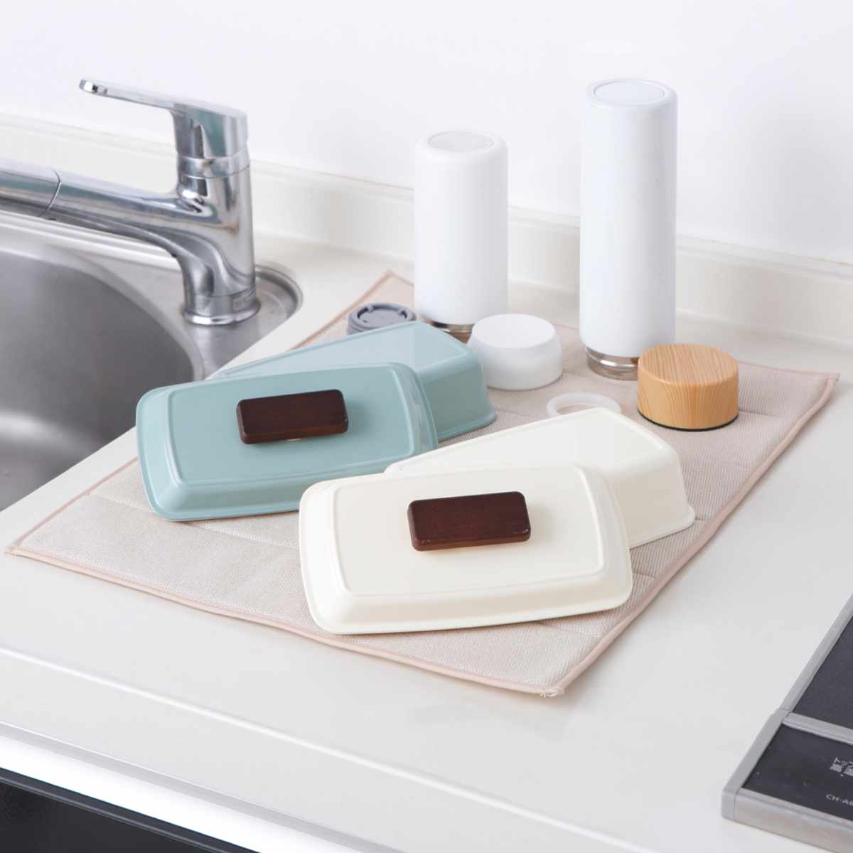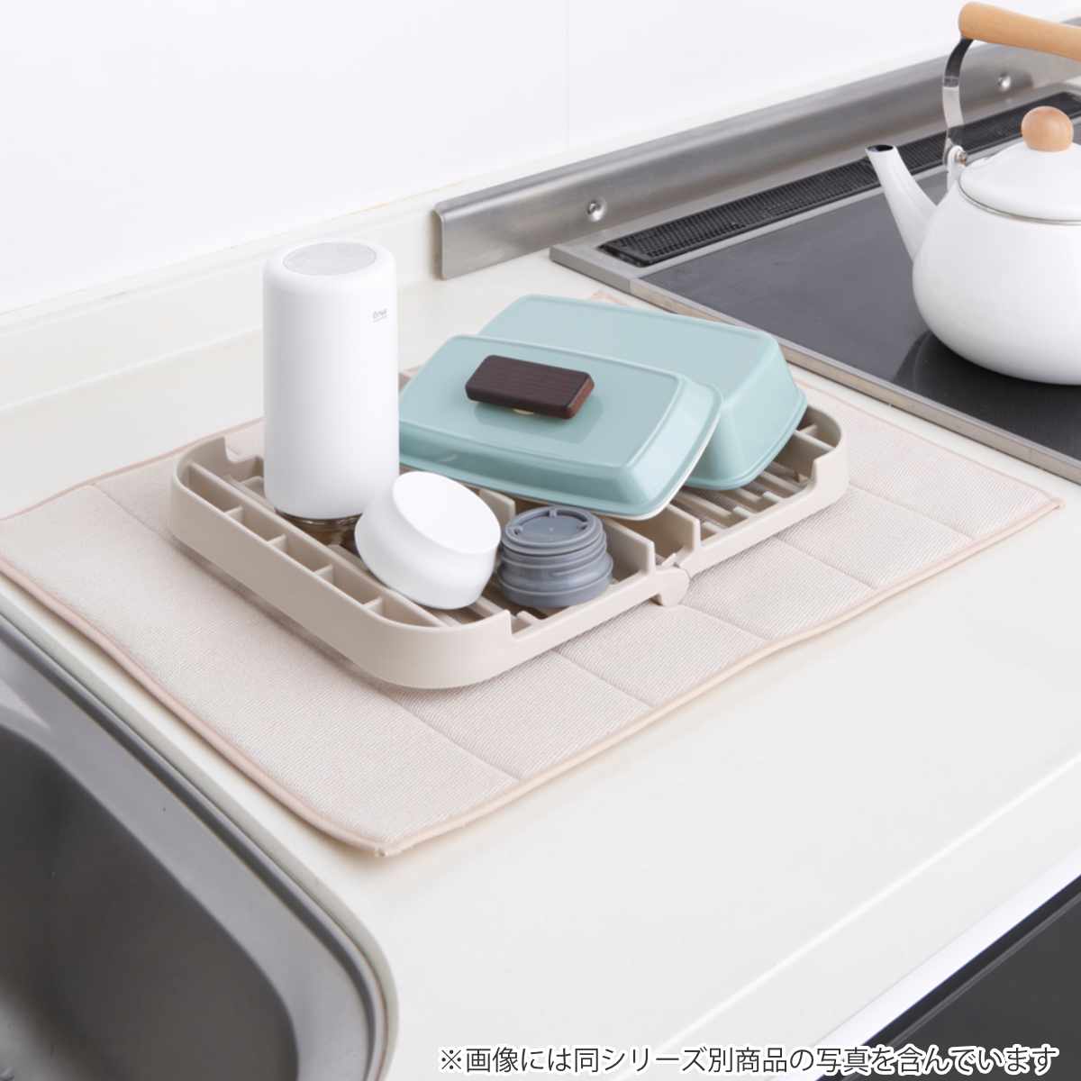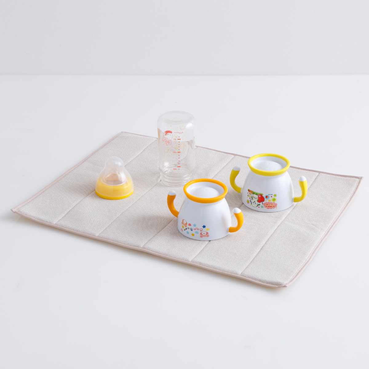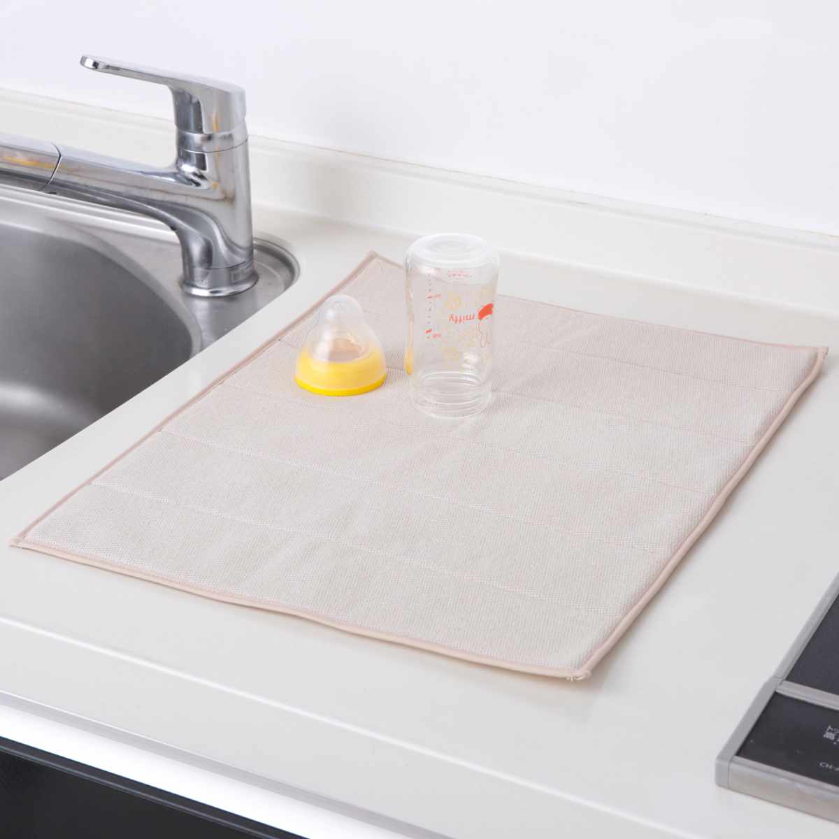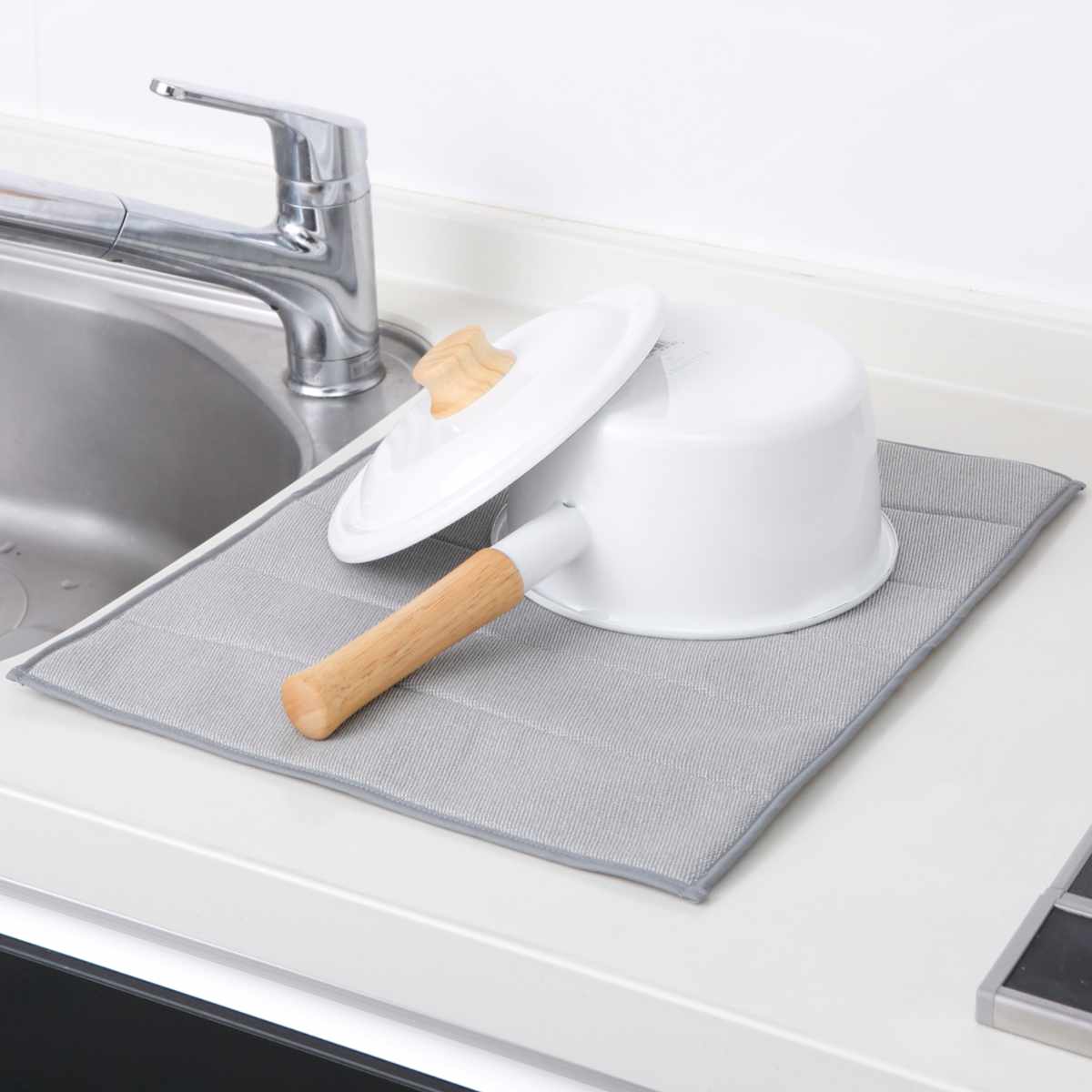 ちょっとした洗いものや、食洗機に入らないフライパンなどを置いて乾かす食器用の吸水マットです。洗い上がりの食器の水分をしっかり吸収、中に挟まれたウレタンがクッションとなり、食器への衝撃をやわらげます。