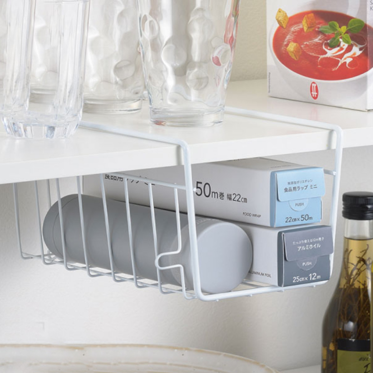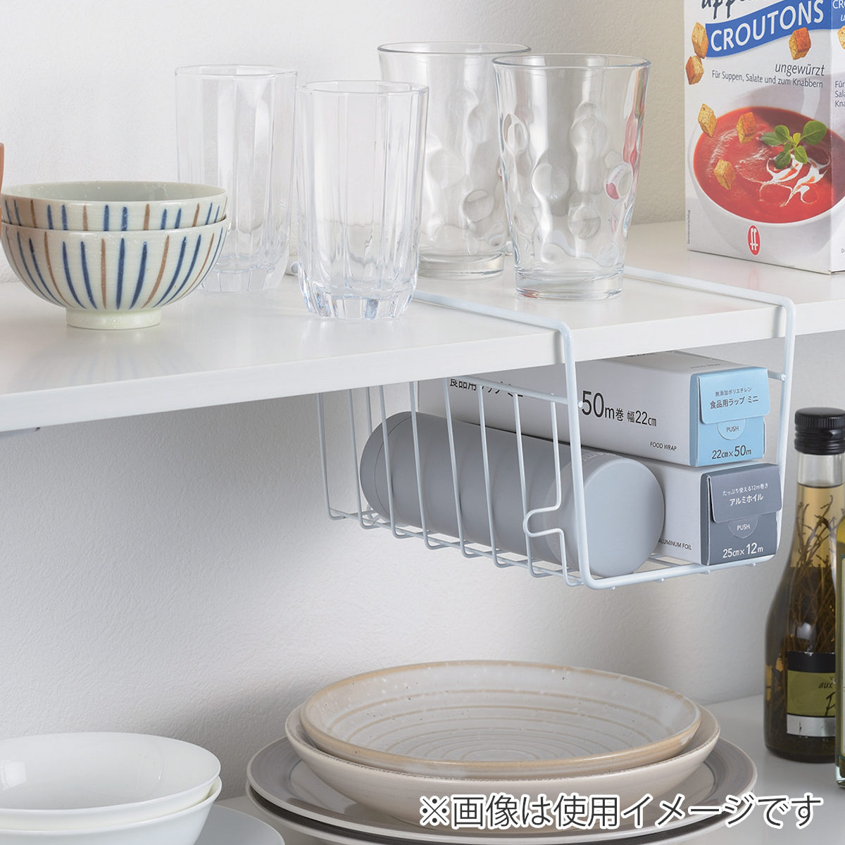 吊り戸棚の棚板に差し込むだけで、簡単に取り付けられるハンガーバスケットです。よく使うキッチンペーパー・ラップ・布巾・調理道具・水筒など、すぐに手の届くところにすっきり収納できます。