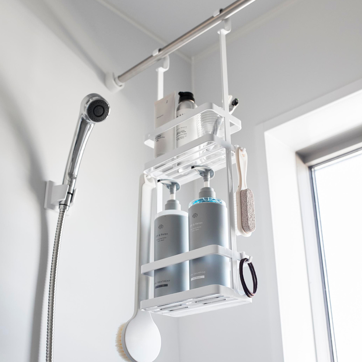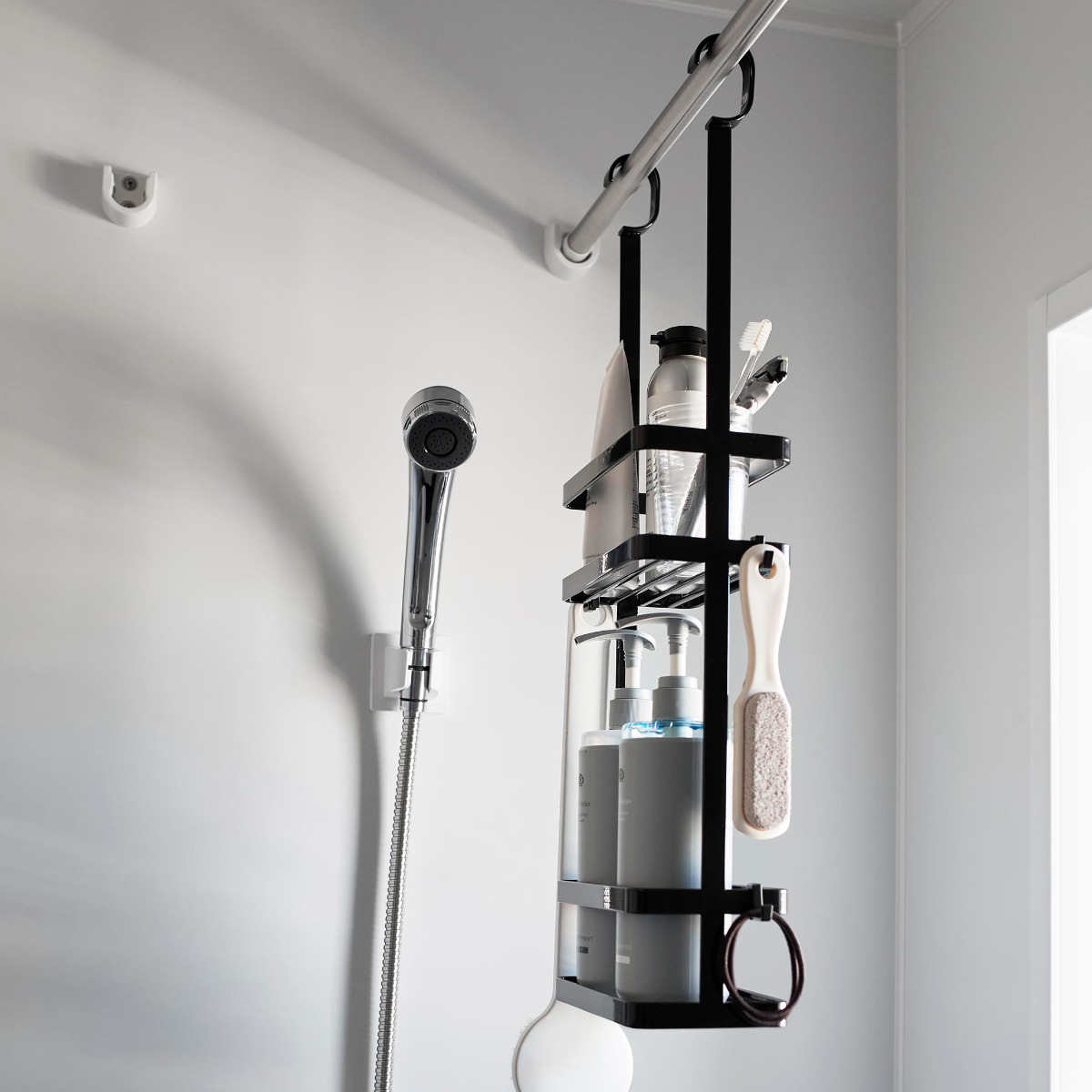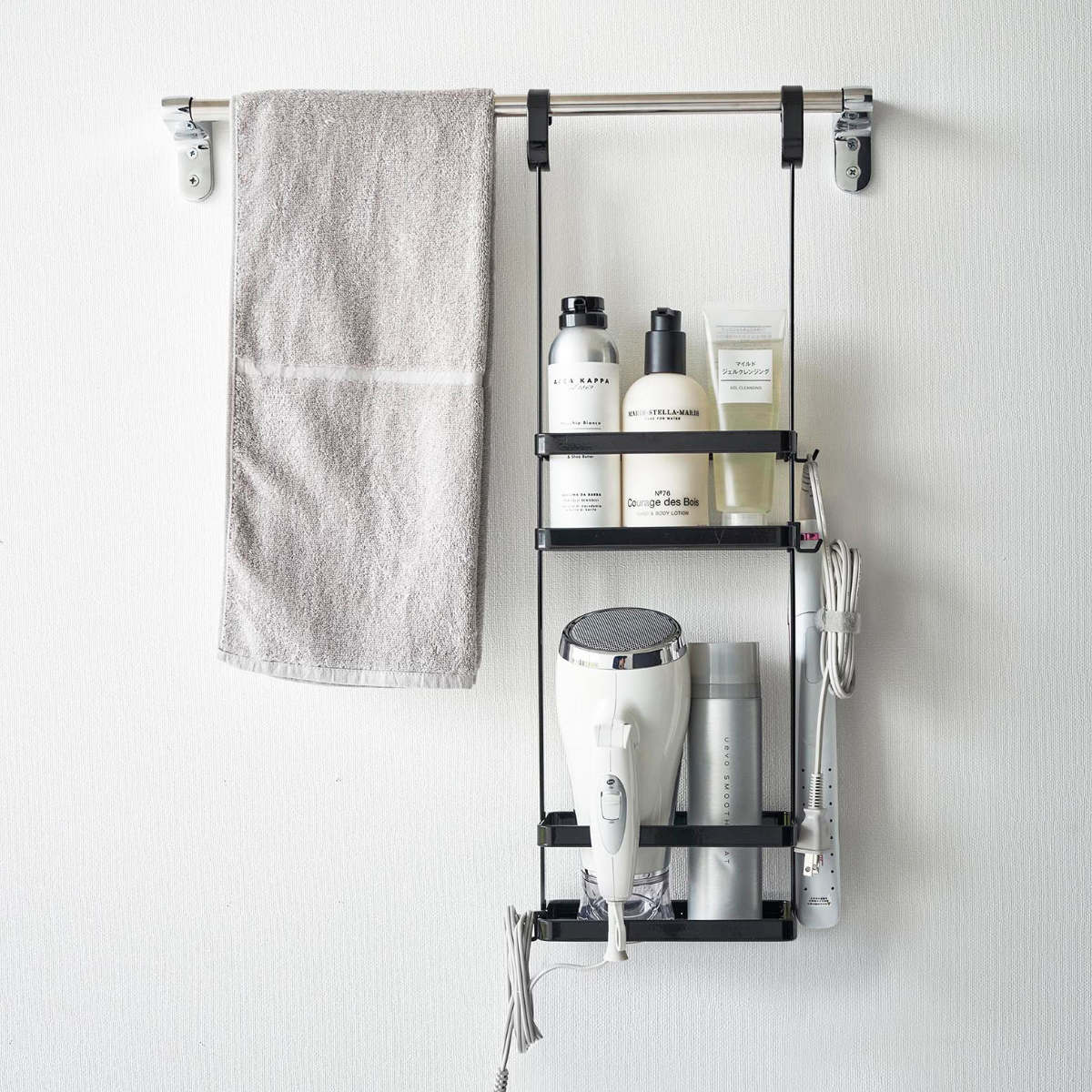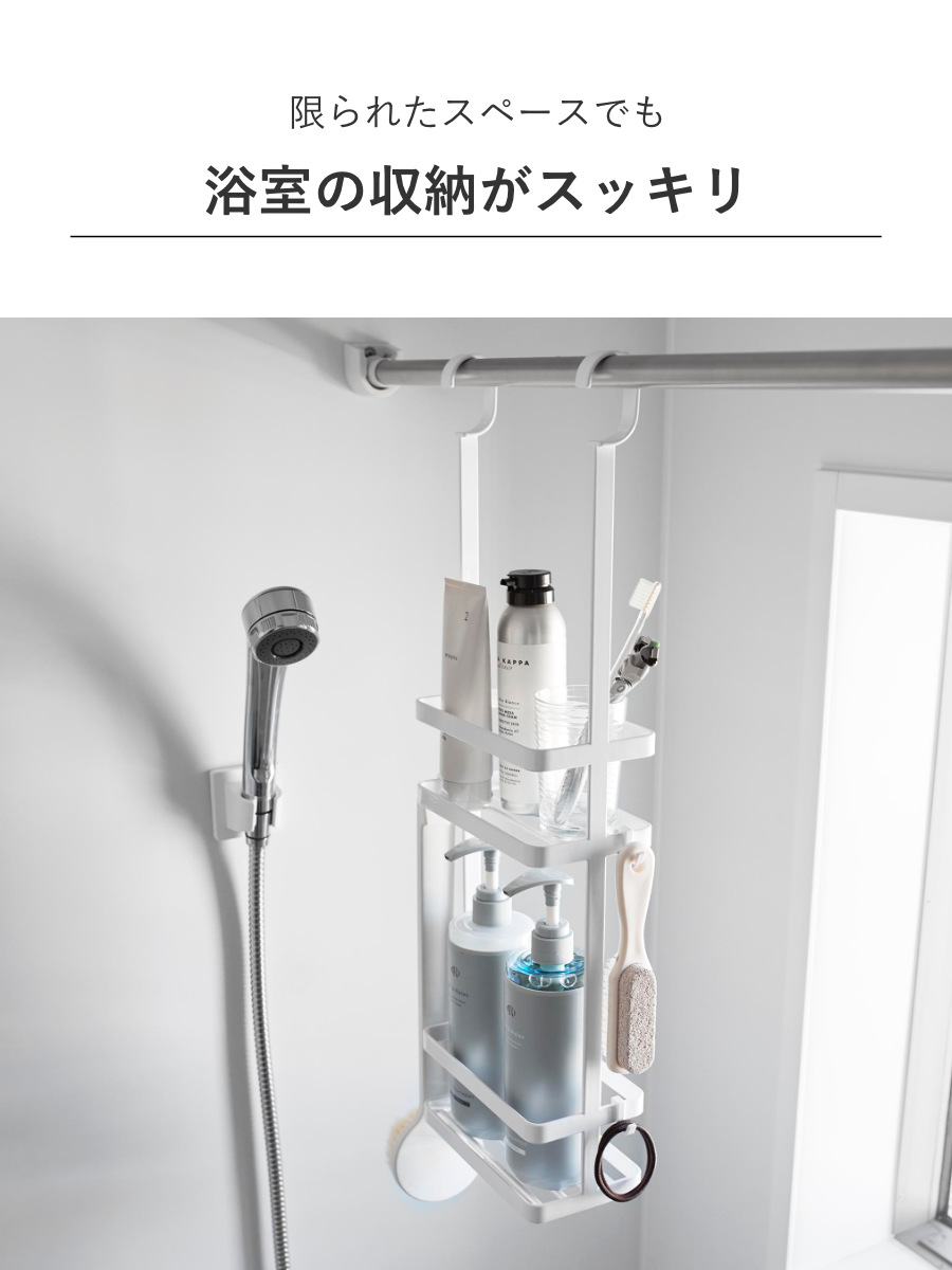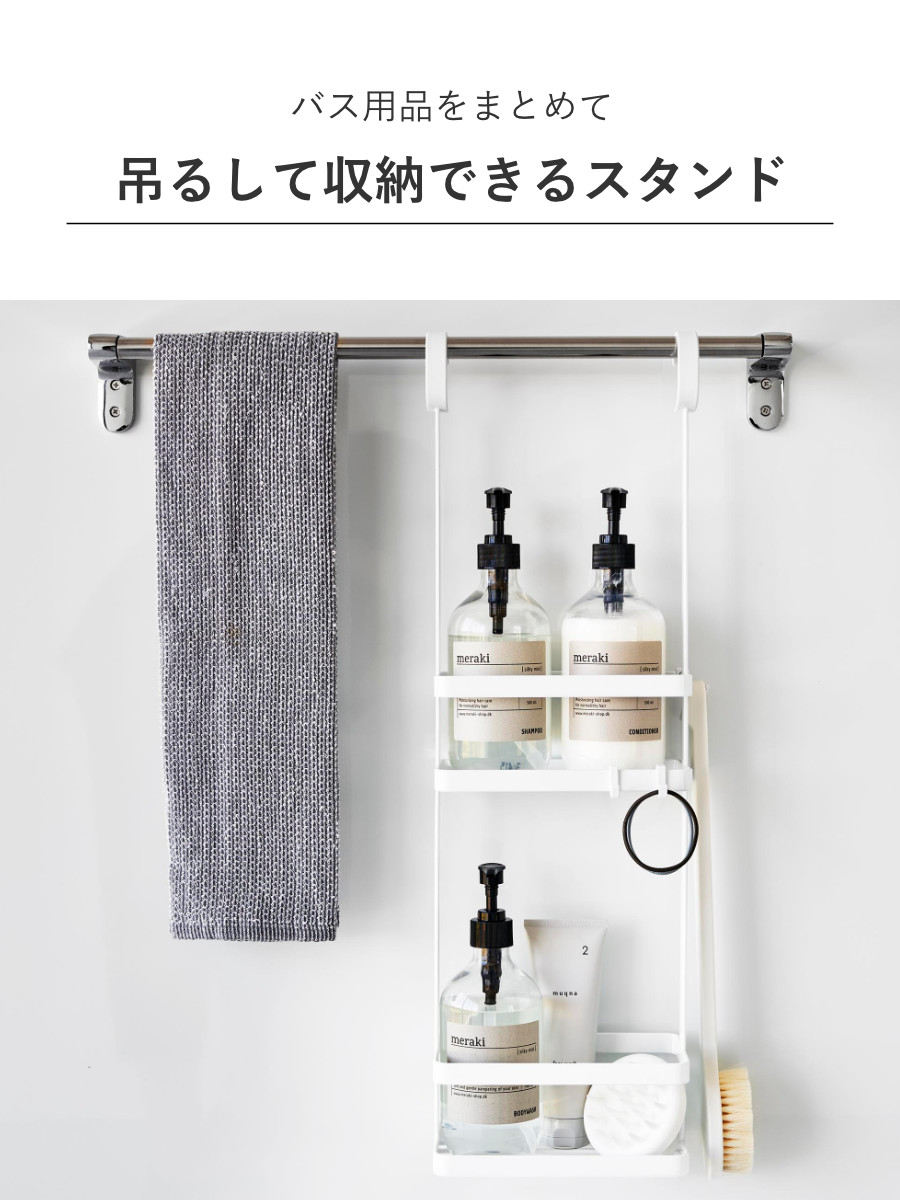 ディスペンサーやチューブなどを吊るして収納できるスタンドです。ひとまとめにバス用品をすっきり収納できます。
