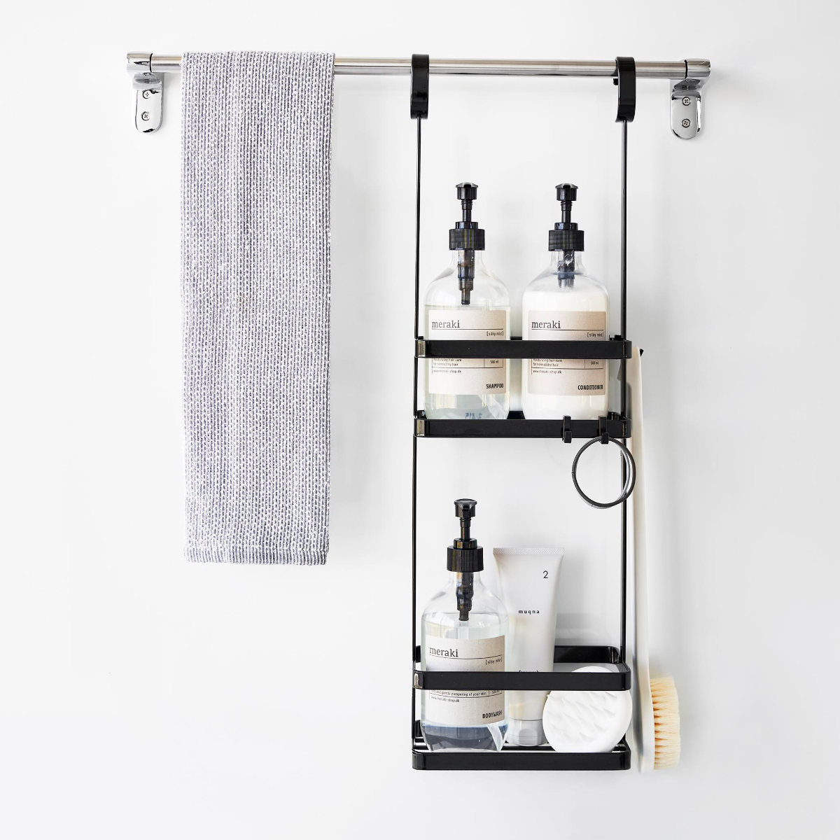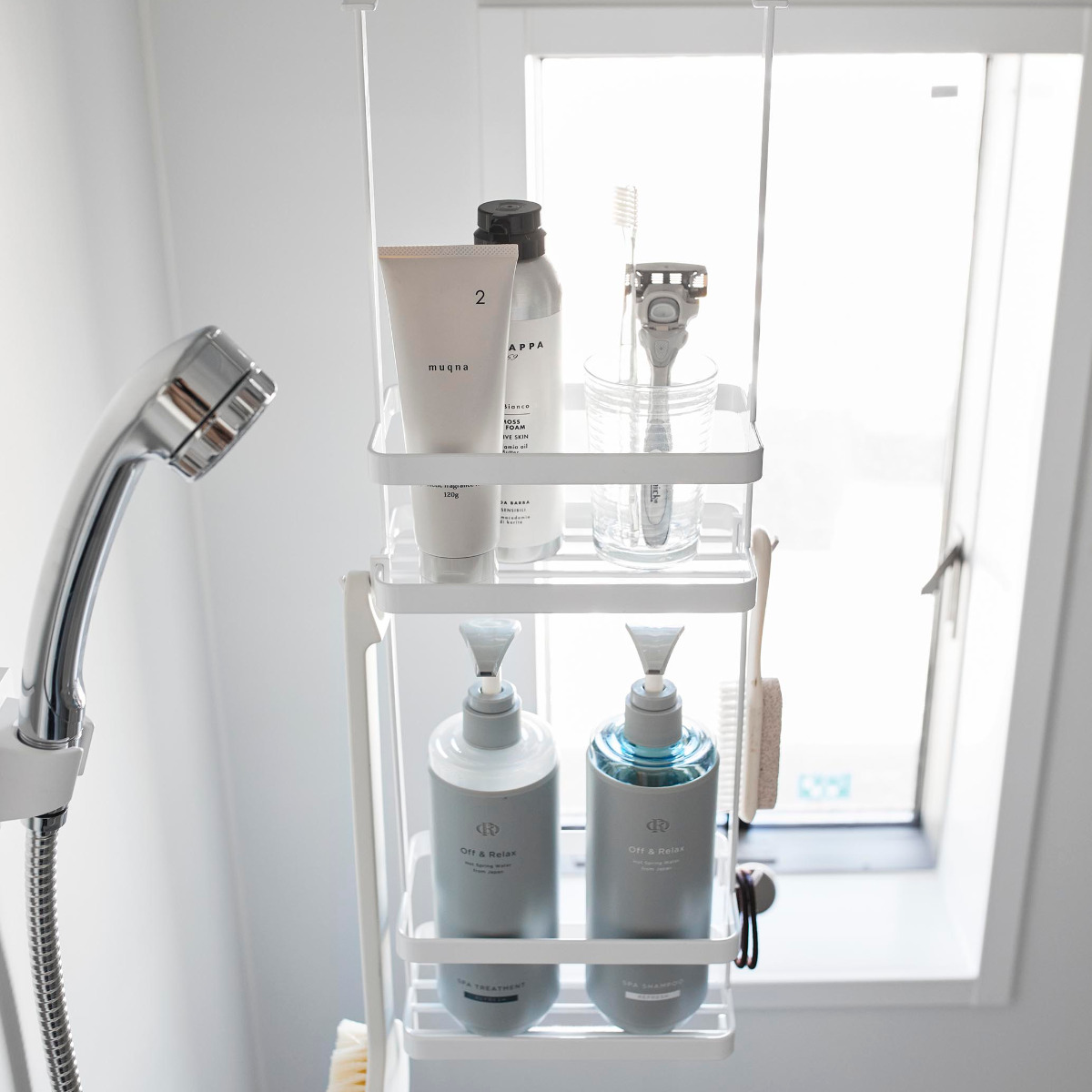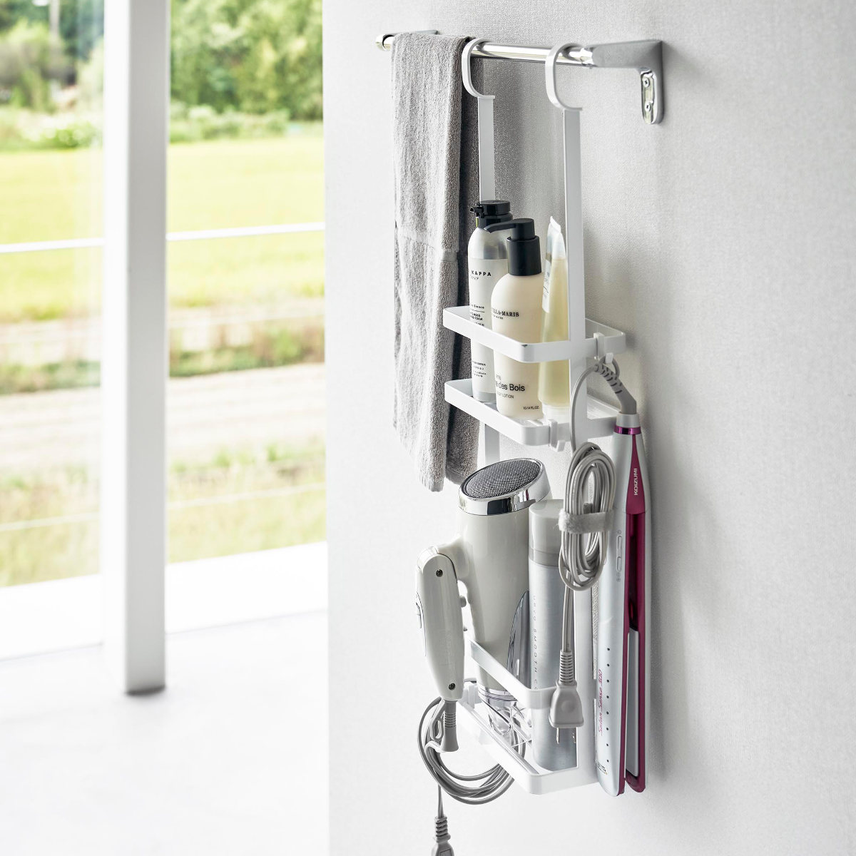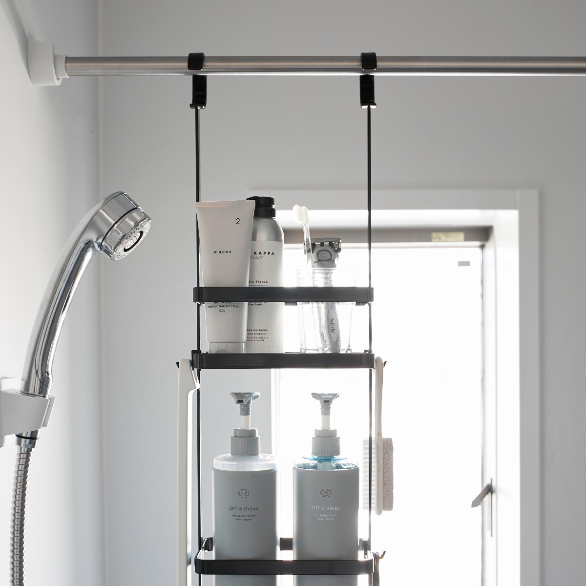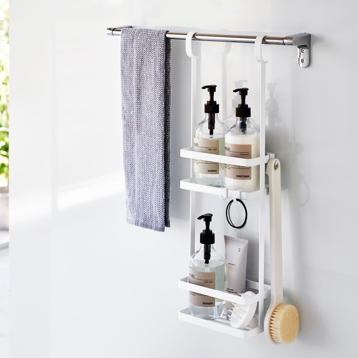 ディスペンサーやチューブなどを吊るして収納できるスタンドです。ひとまとめにバス用品をすっきり収納できます。