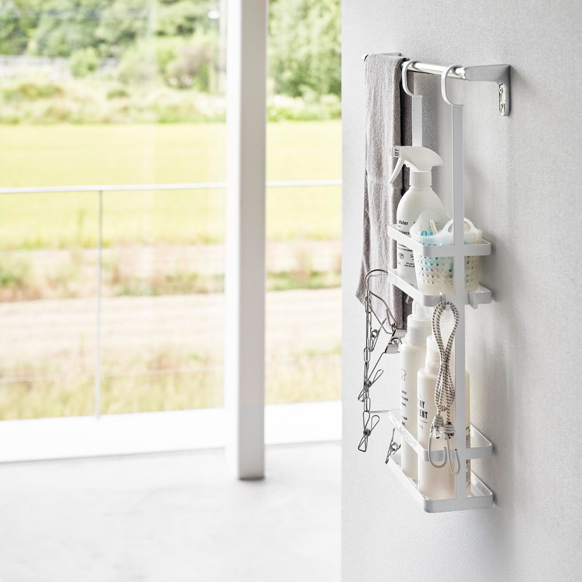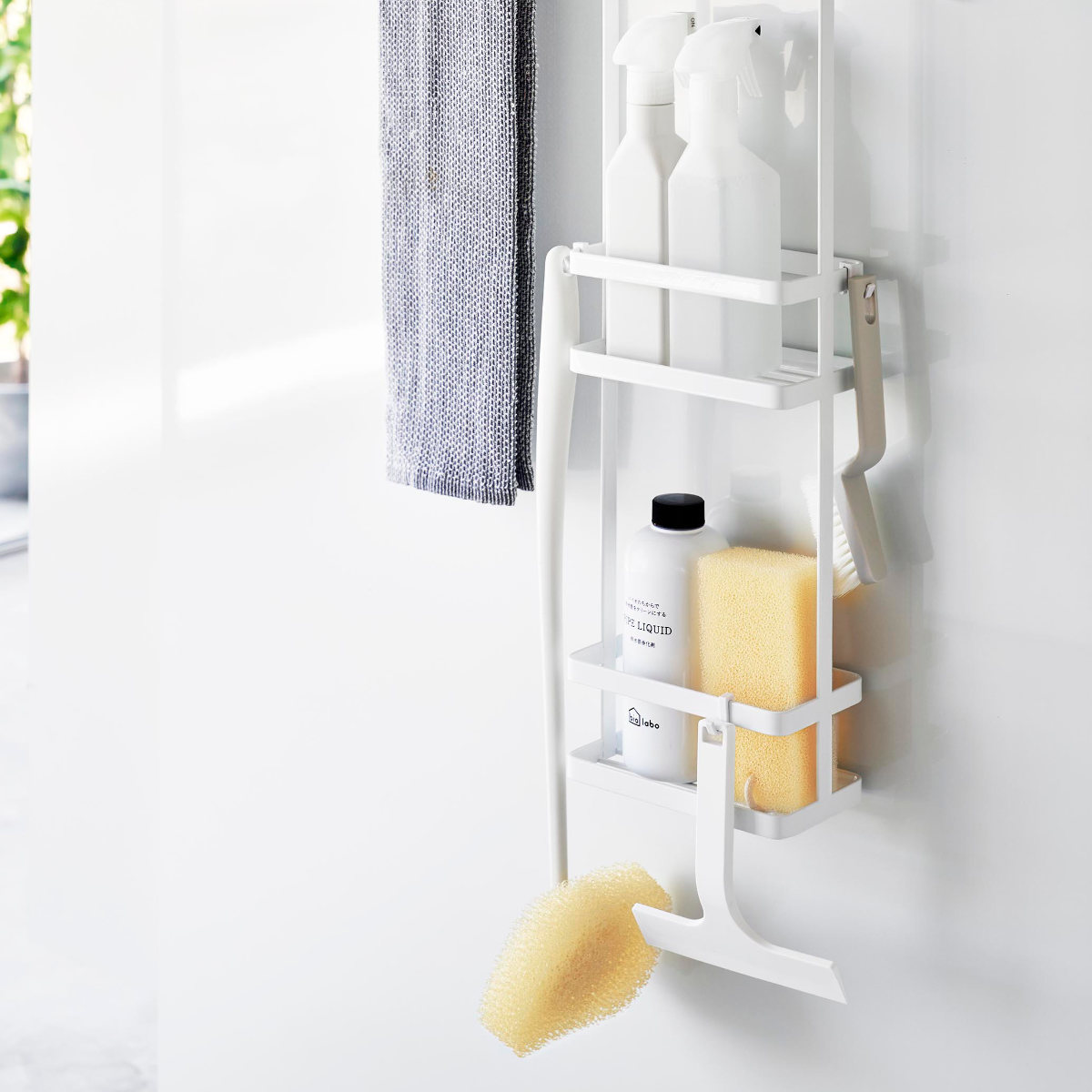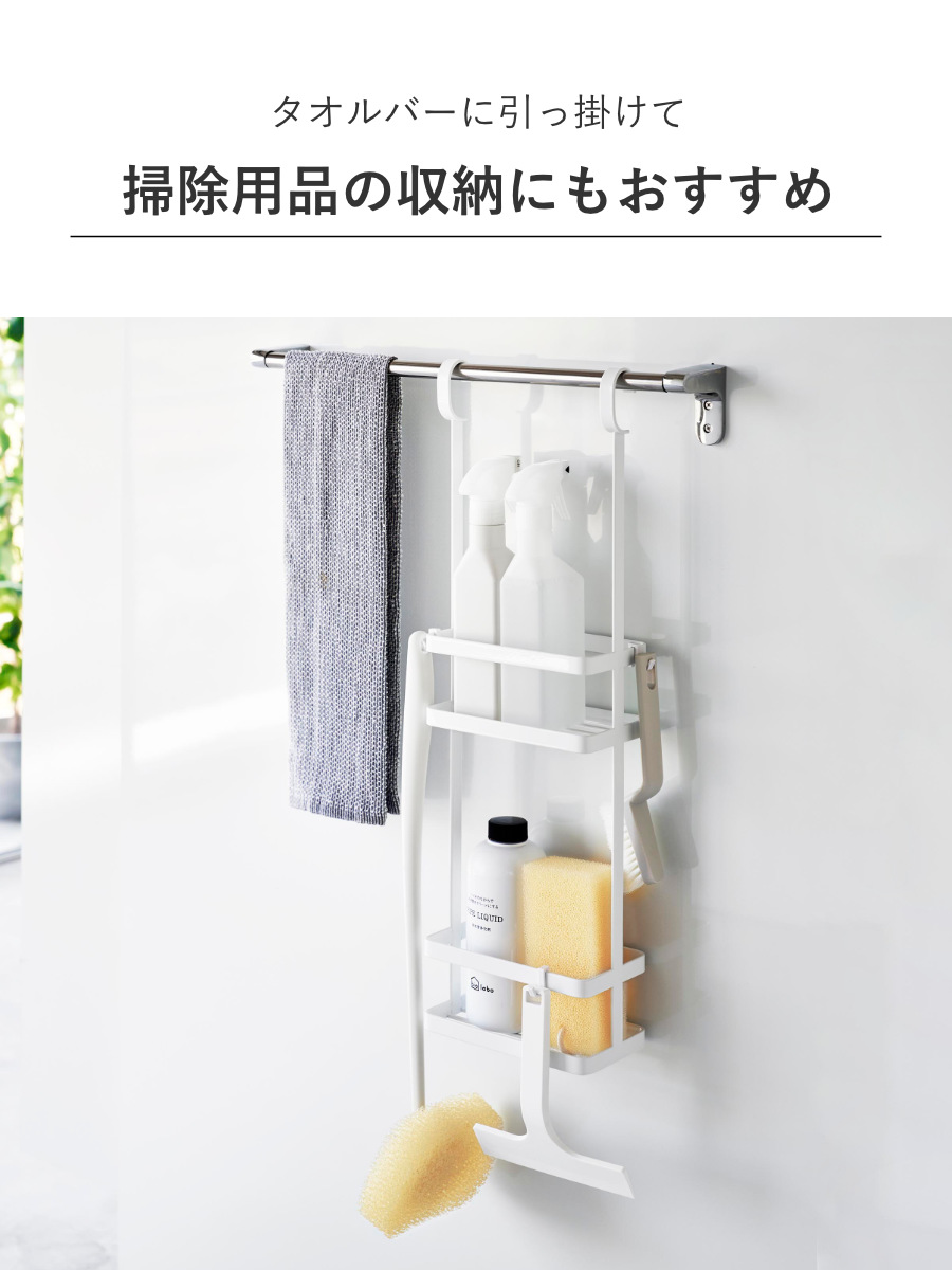 浴室内のタオルバーに引っ掛けて、お風呂掃除グッズの収納にも便利です。濡れたままでも吊るして収納できるので乾きやすくて便利です。