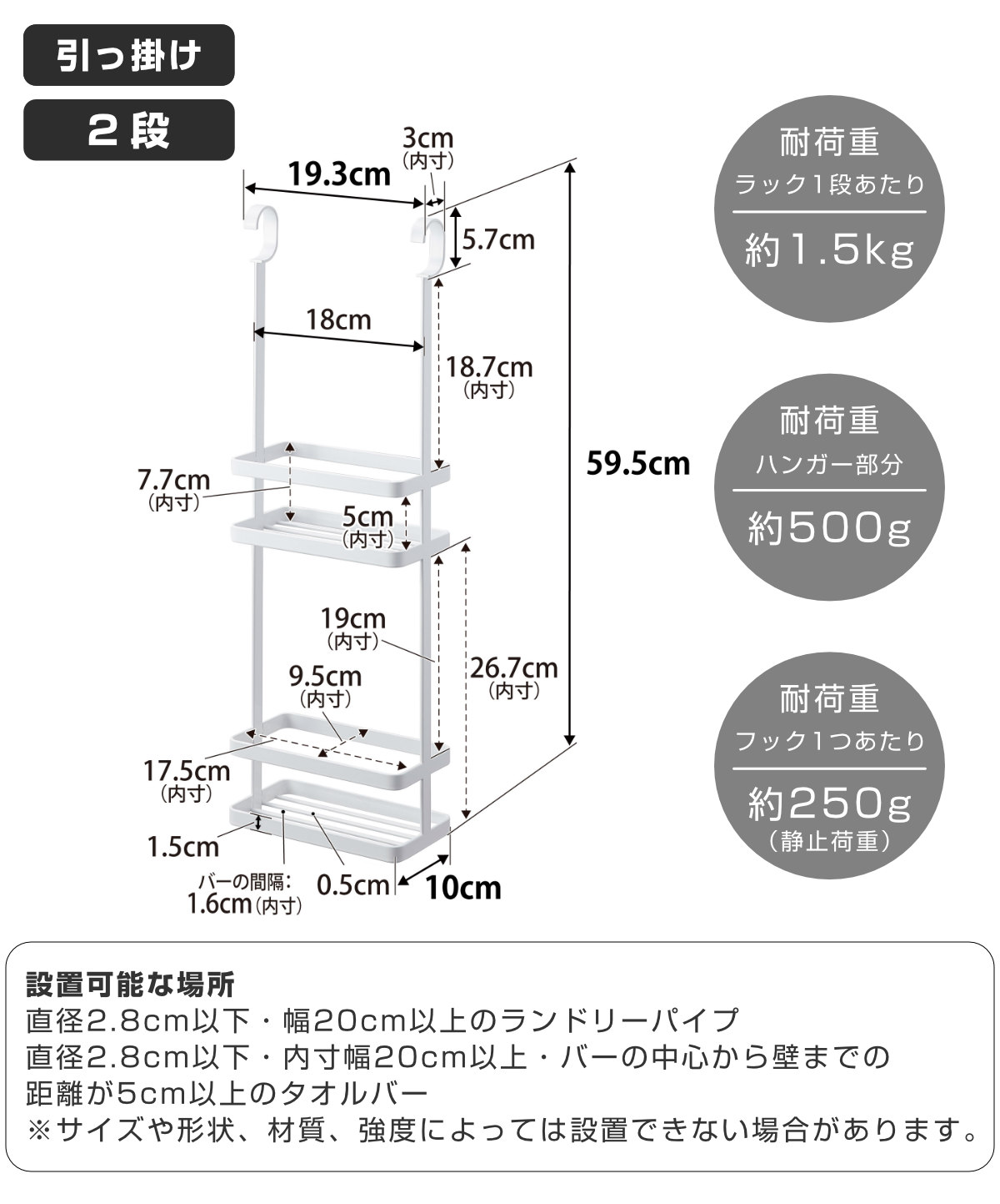 | 耐荷重 | ラック1段あたり:1.5kg フック1つあたり:250g(静止荷重) |