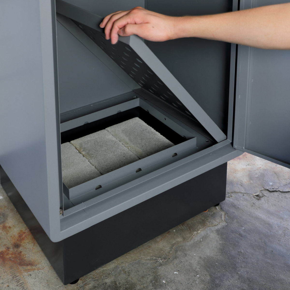 中底の天板を外すとレンガやブロックを入れるスペースがあり、強風などで動いてしまうのを防ぐための重りをスマートに隠せます。
