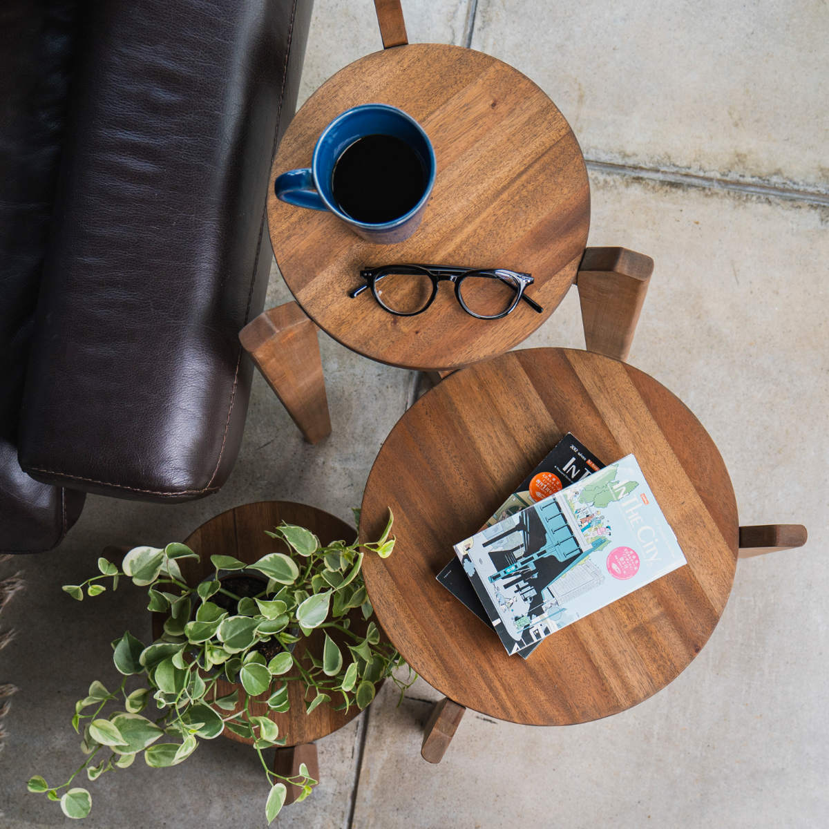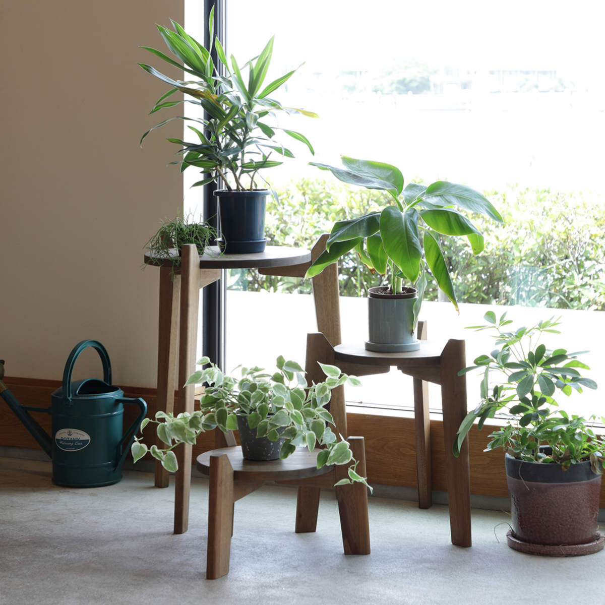 花台やサイドテーブルなど様々な用途で使える、高さの異なるテーブル3点セットです。3段階に異なる高さの脚を組み合わせることで、お部屋のインテリアグリーンや小物を高低差を利用してバランスよくディスプレイすることができます。