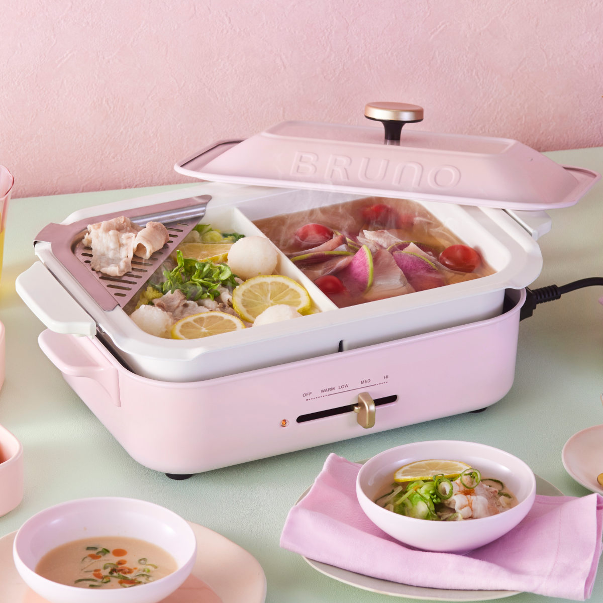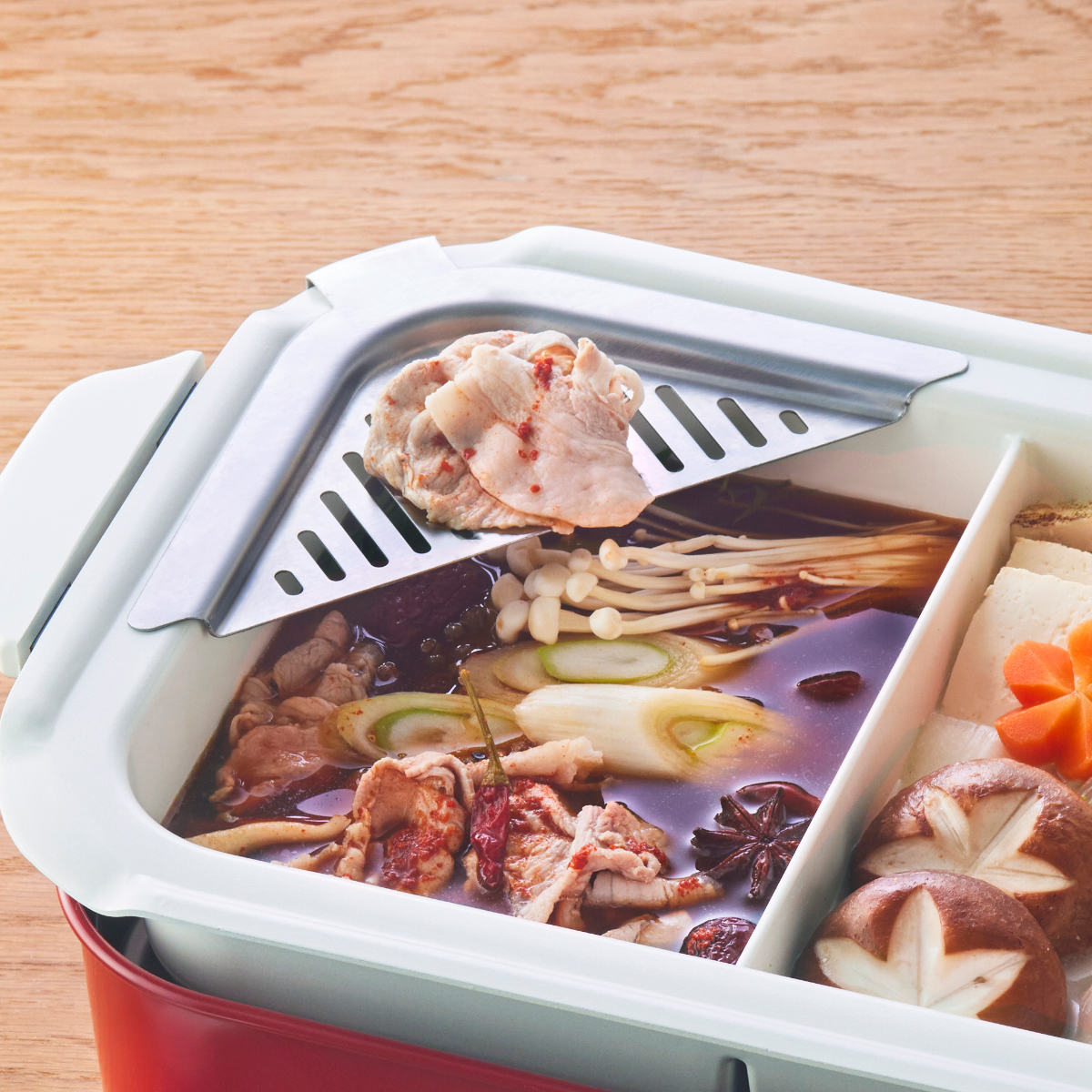 大人気のコンパクトホットプレートで使える専用の仕切り鍋が登場しました。異なる味のスープを同時に調理できるので、辛いのが苦手だったり味の好みが違っても友達や家族みんなで一緒にお鍋を囲めます。もちろん1人で色んな味を堪能したい方にもおすすめです。