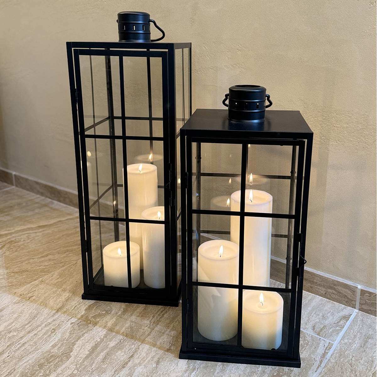 ブラック×四角の窓の様なデザインがスタイリッシュなランタンです。 直径3インチキャンドルが3本、または直径3.5インチキャンドルが2本入ります。 キャンドルの灯がガラスに反射し、幻想的な空間を作り出します。