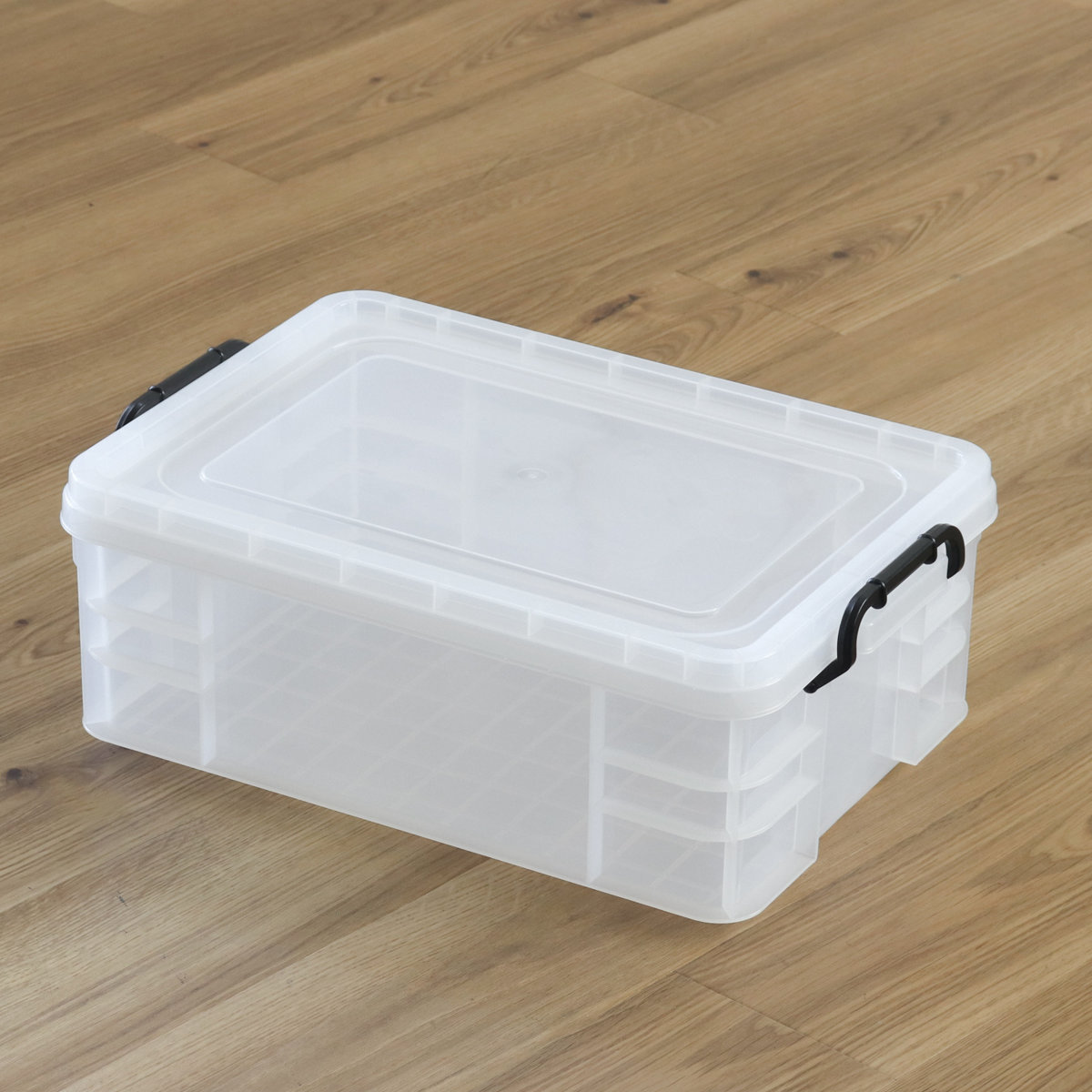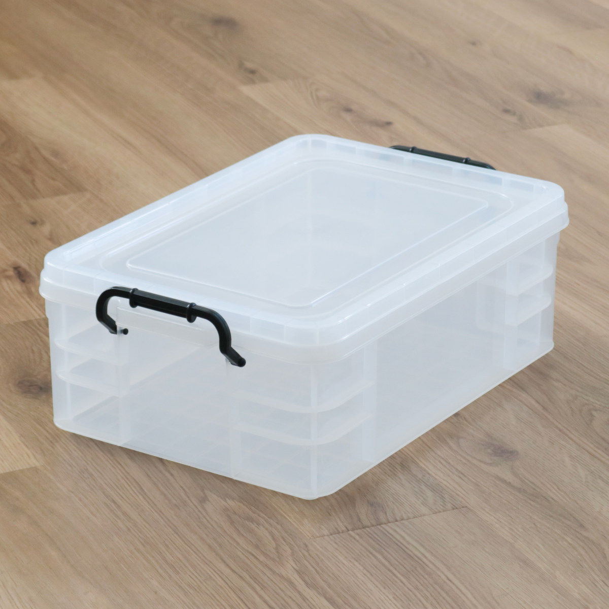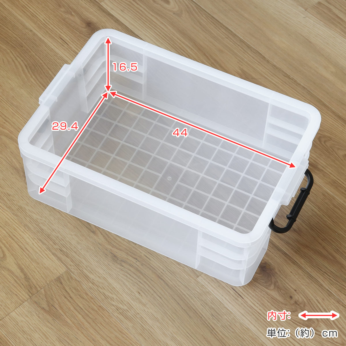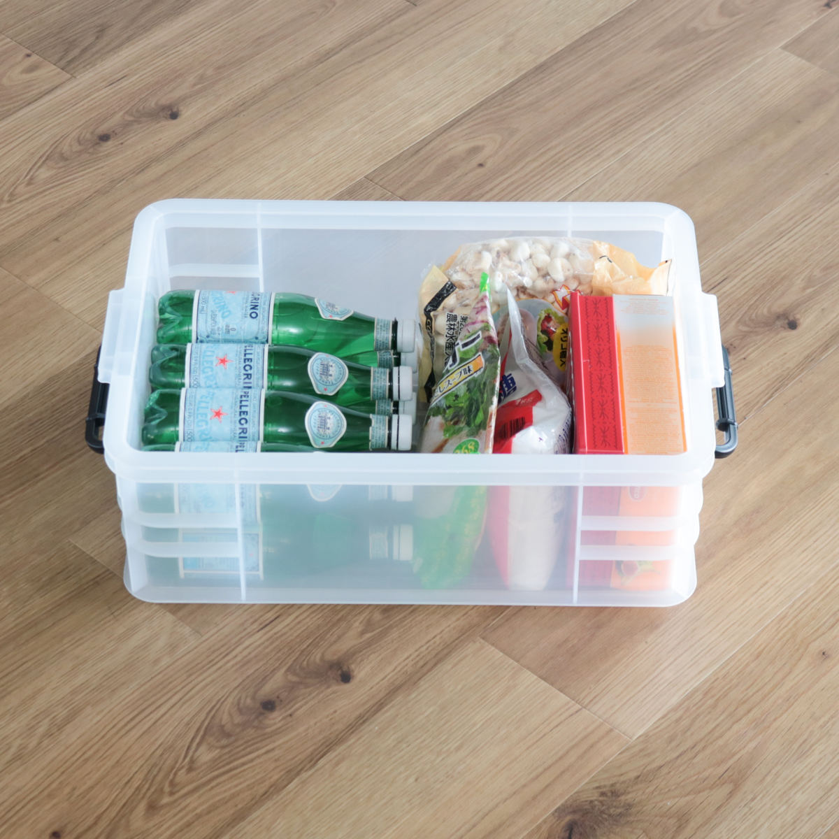 収納物が一目でわかり、整理がしやすいクリアボックスです。ポリプロピレン製で軽量かつ耐久性があります。耐水性があるため、湿気を避けたい食品の保管にも適しています。スタッキングが可能でスペースを有効活用できます。