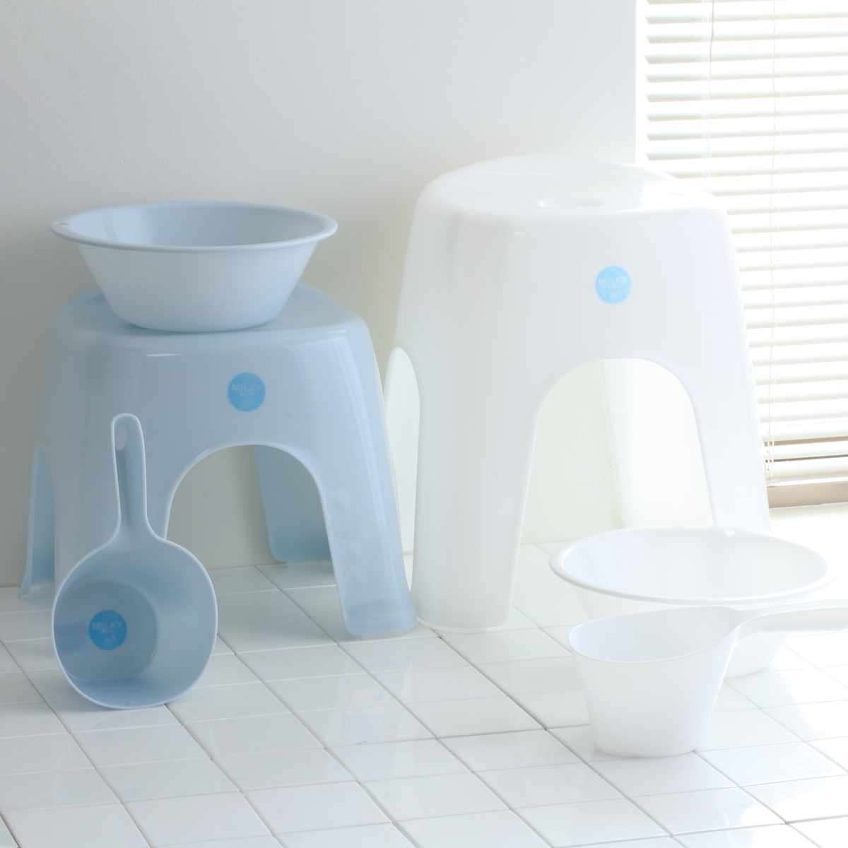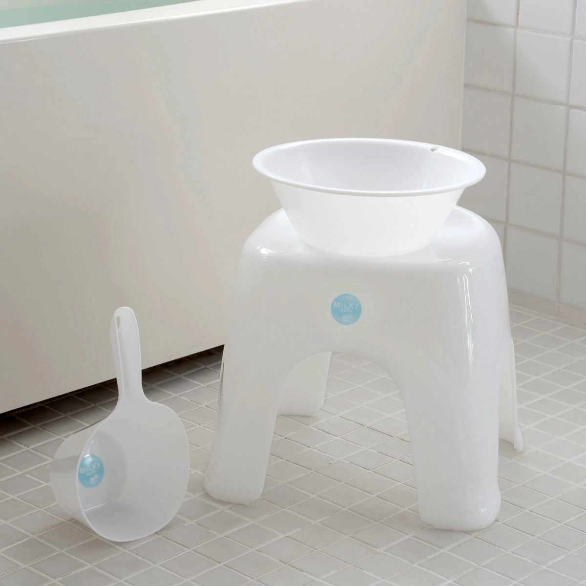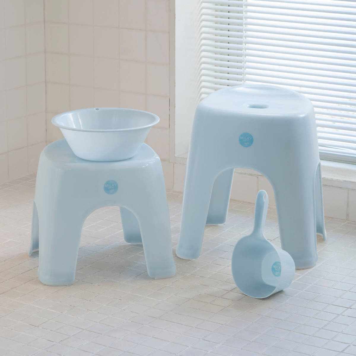 透明感のある可愛らしい色味のミルキーバスシリーズです。風呂椅子、湯おけ、手桶で揃えることで、より統一感のある空間を演出します。