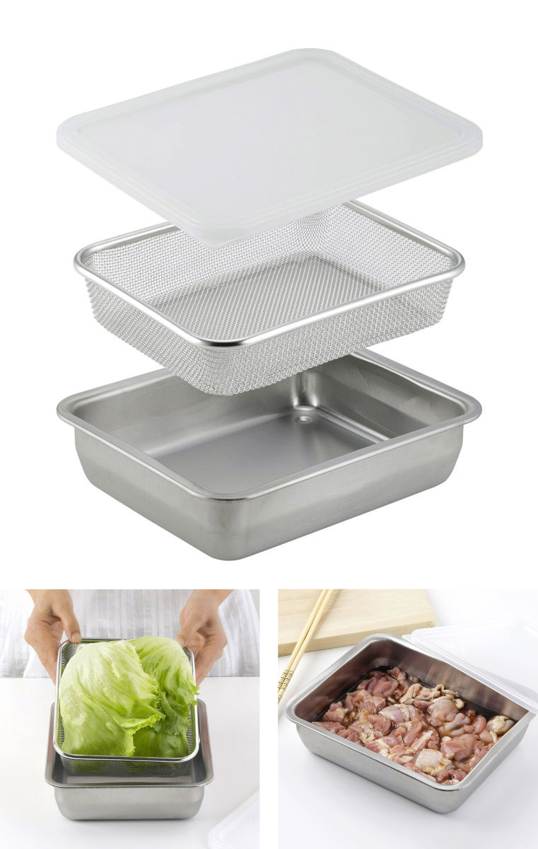 ●食材の水切りや冷蔵保存に便利な、ザル・バット・フタの3点セットです。