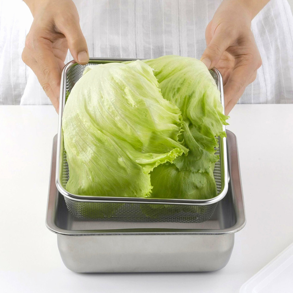 食材の水切りや冷蔵保存に便利な、ザル・バット・フタの3点セットです。熱伝導に優れたステンレス製で食材を素早く冷却でき、野菜の水切りから冷蔵保存、お肉の下味付けなど、お料理の下ごしらえに最適です。