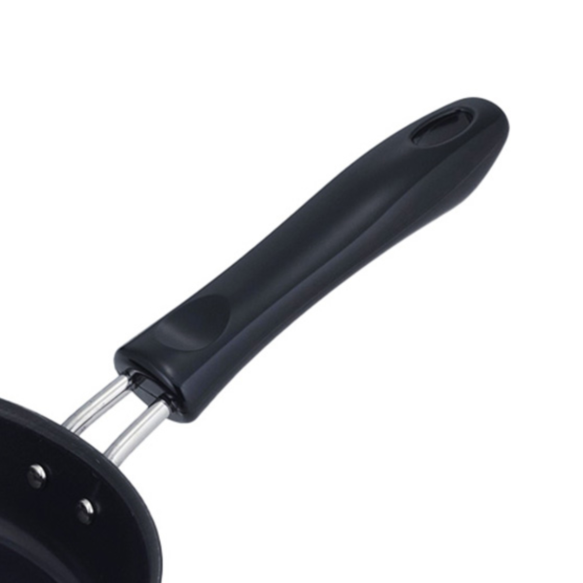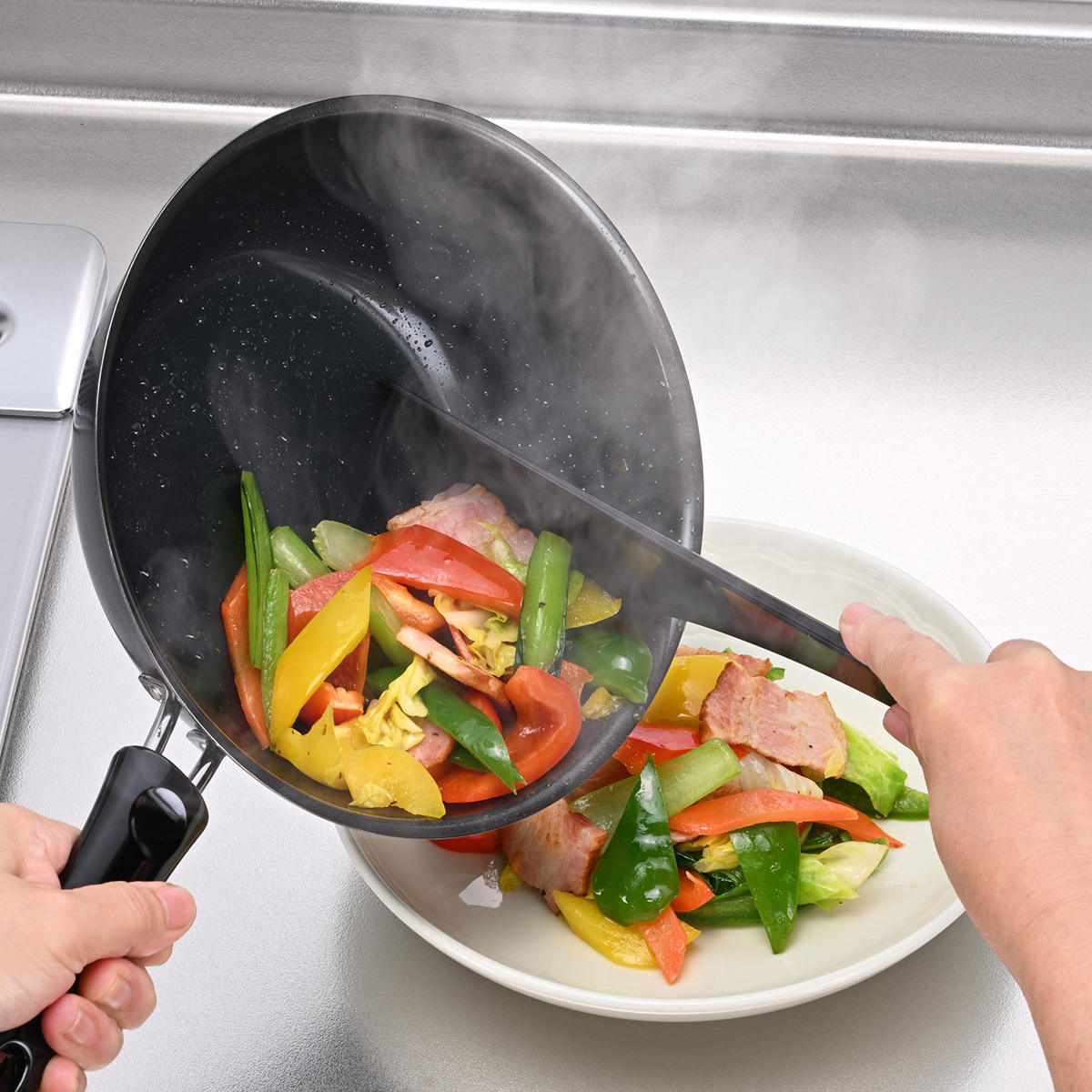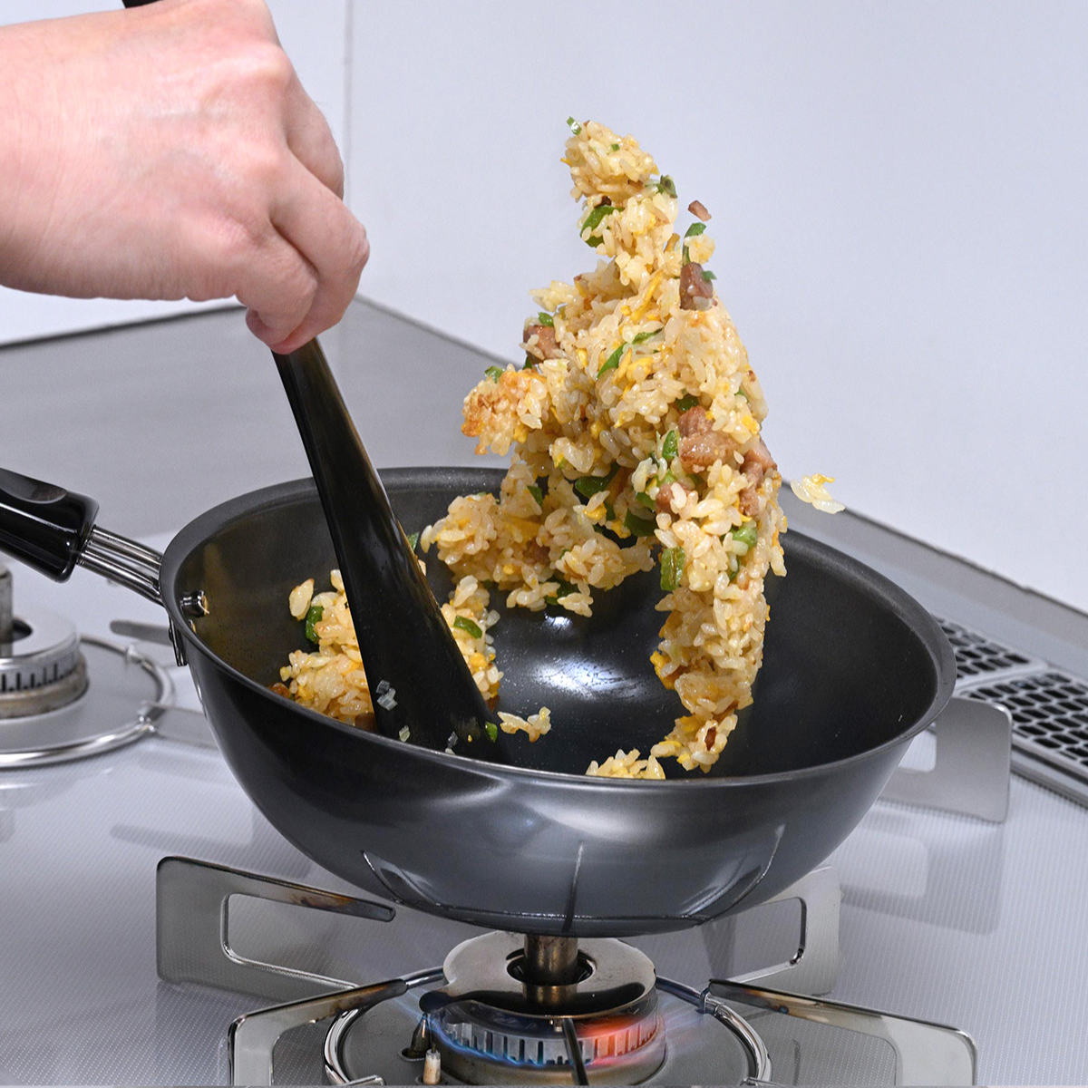 樹脂製のハンドルで熱さを感じにくく、快適に調理できます。また、親指部分にくぼみが付いているので持つポイントがわかりやすいです。