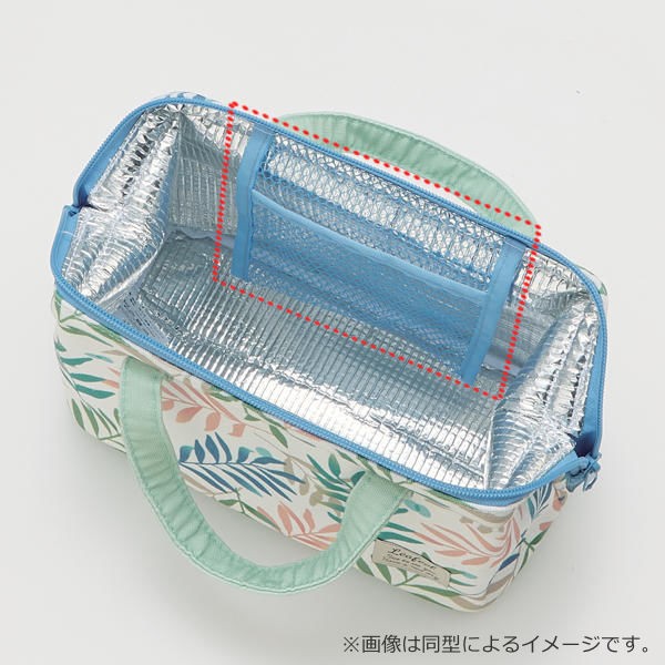 バッグはマチが広く、お弁当箱の出し入れがスムーズにできます。内側はアルミ蒸着素材で保冷バッグとしてお使いいただけます。また、メッシュポケットが内側に付いており、保冷剤を入れとしても使えるほか、小物やお菓子などの小さなものを入れておくのに便利です。