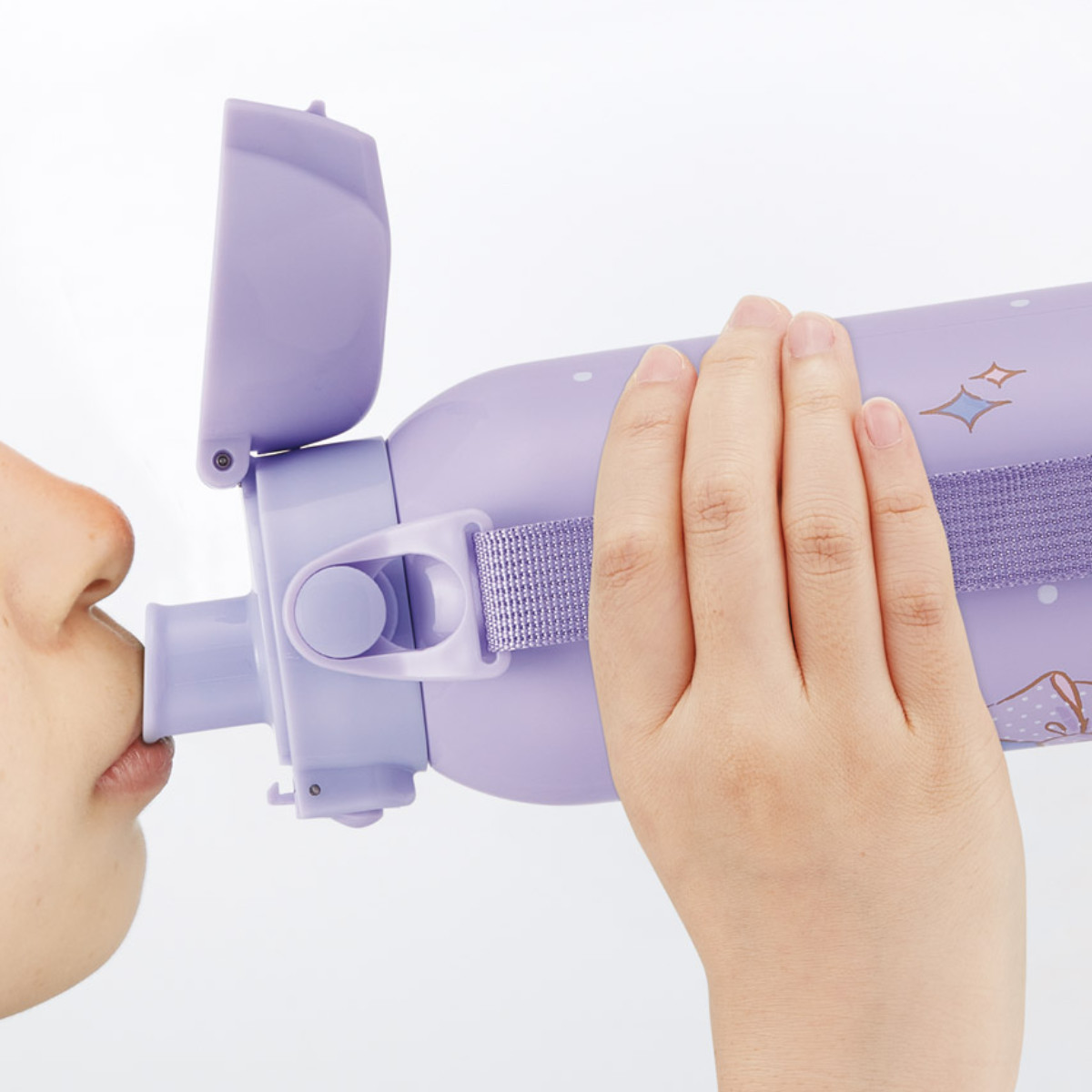 水筒の蓋はボタンを押すだけで開けることができるワンタッチ式。さらに持ち運びに安心のロック機能付きです。