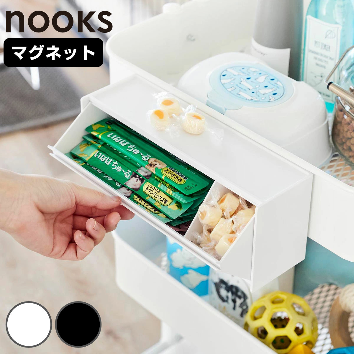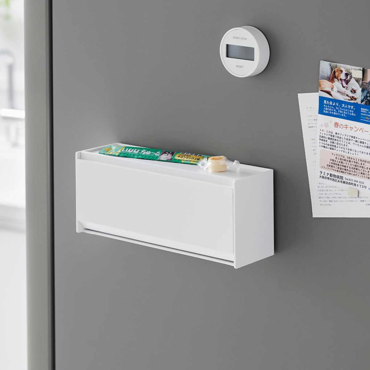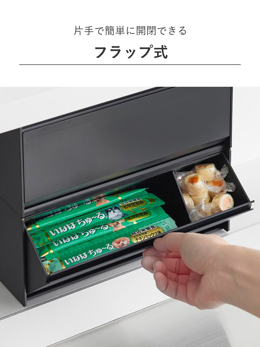 マグネットで取り付けできるペットのおやつ収納ケースです。冷蔵庫やキッチンパネルはもちろん、ペット用品をまとめたマグネットが付くスチールワゴンの側面に設置するのもおすすめです。おやつを浮かせて収納できるのでいたずら防止にもなります。