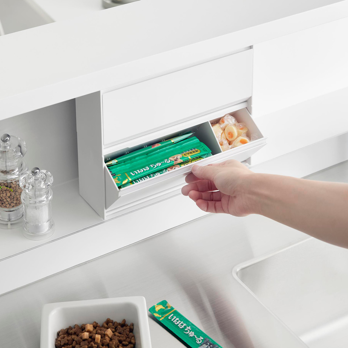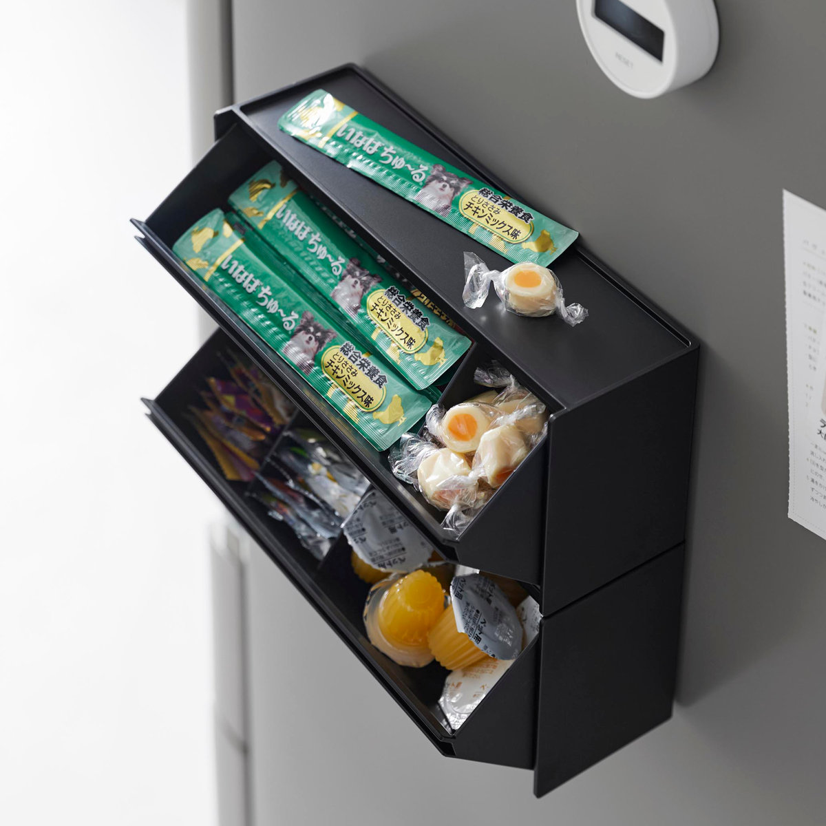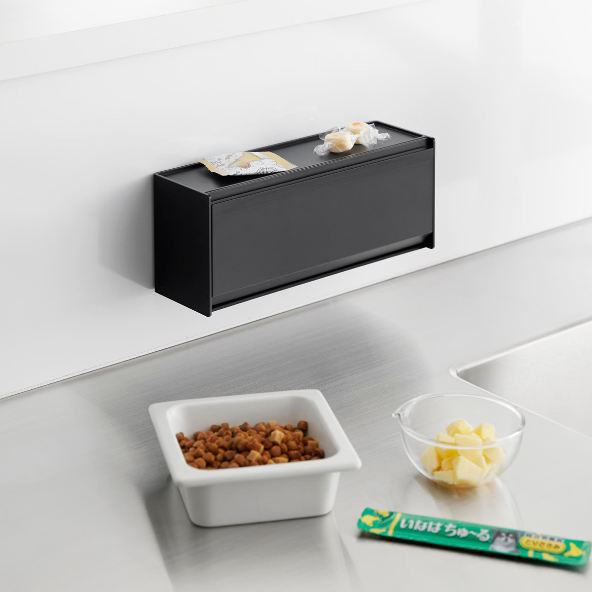 マグネットで取り付けできるペットのおやつ収納ケースです。冷蔵庫やキッチンパネルはもちろん、ペット用品をまとめたマグネットが付くスチールワゴンの側面に設置するのもおすすめです。おやつを浮かせて収納できるのでいたずら防止にもなります。