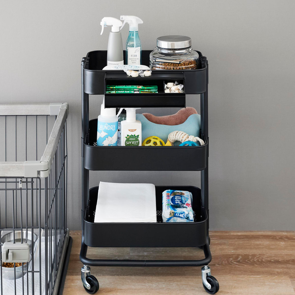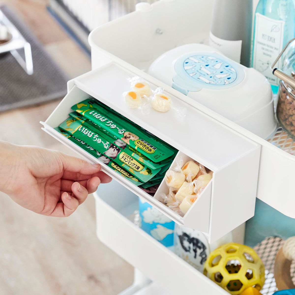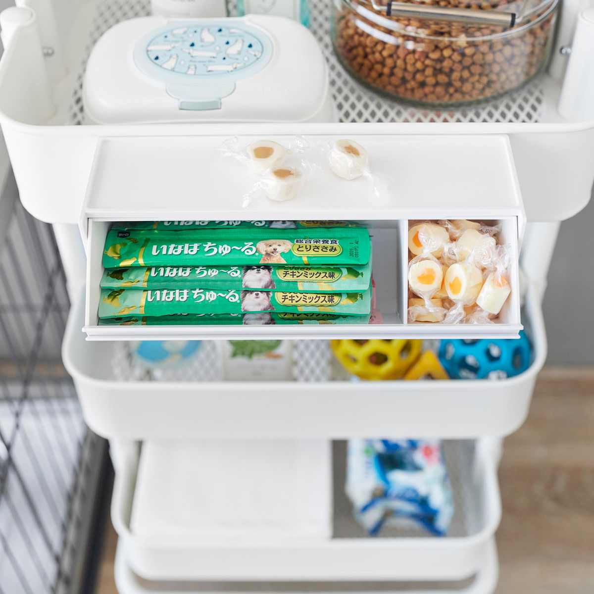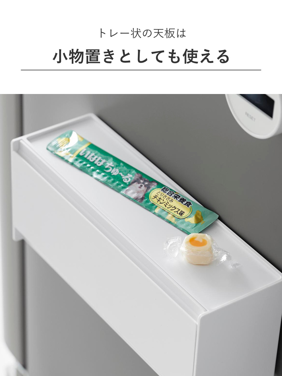 天板はトレーになっているので小物置きとしてもお使いいただけます。その日あげる分のおやつを出しておくのにも最適です。