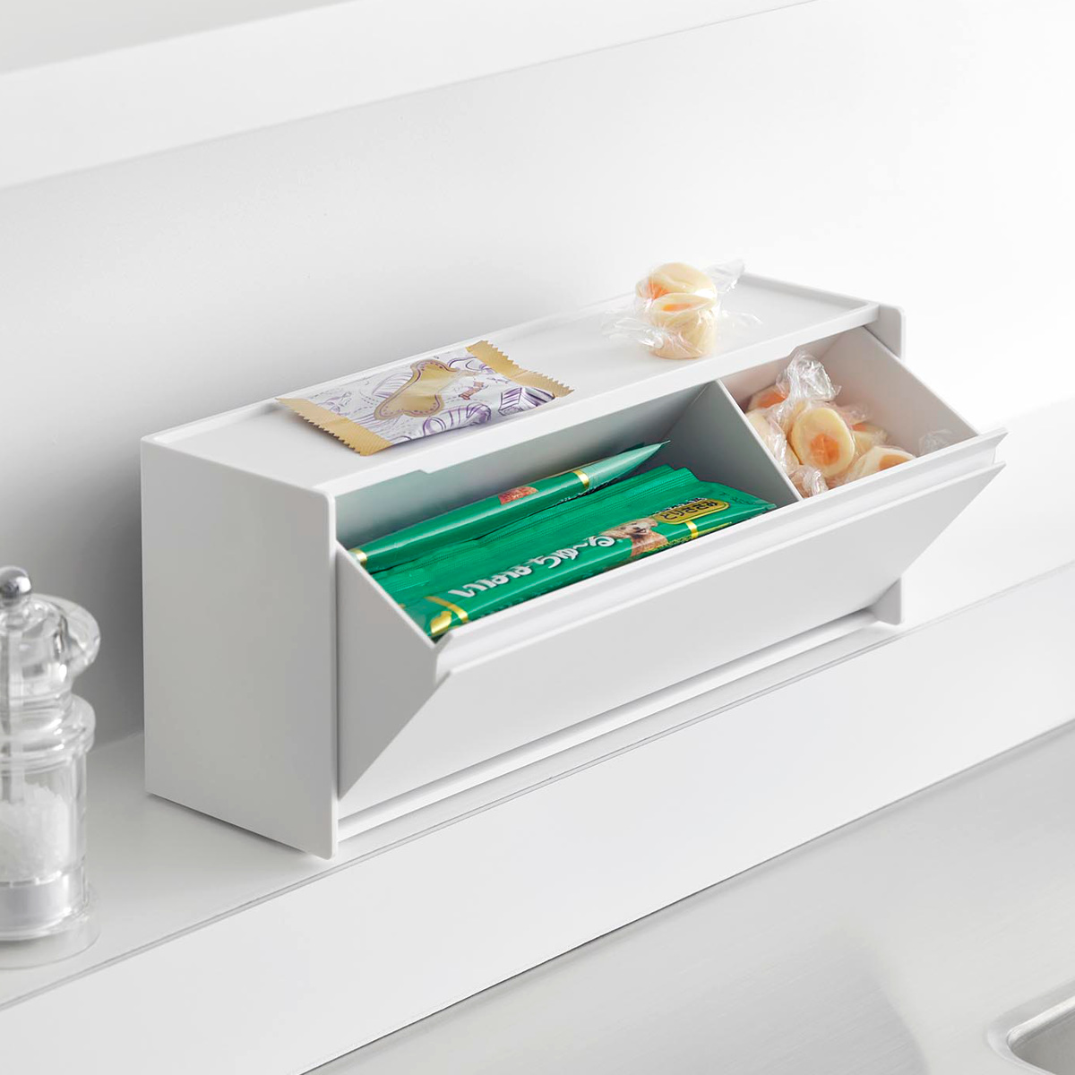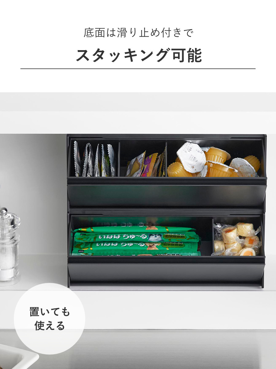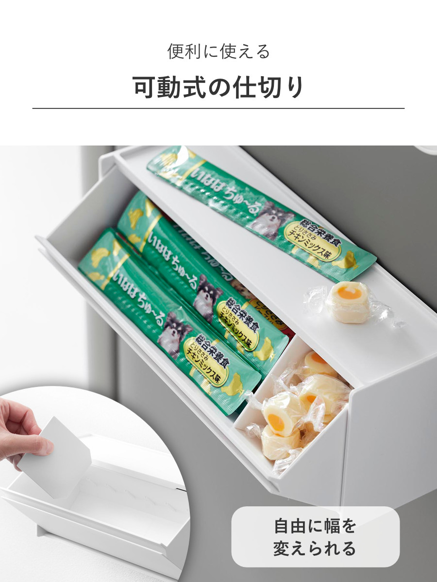 整理に便利な可動式の仕切りが3枚付属しています。2.8cm間隔で自由に取り付けできるので、収納したいおやつに合わせてカスタマイズできます。