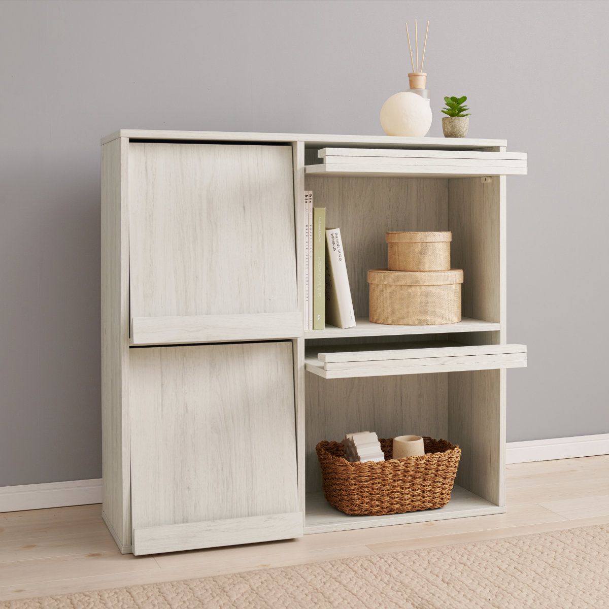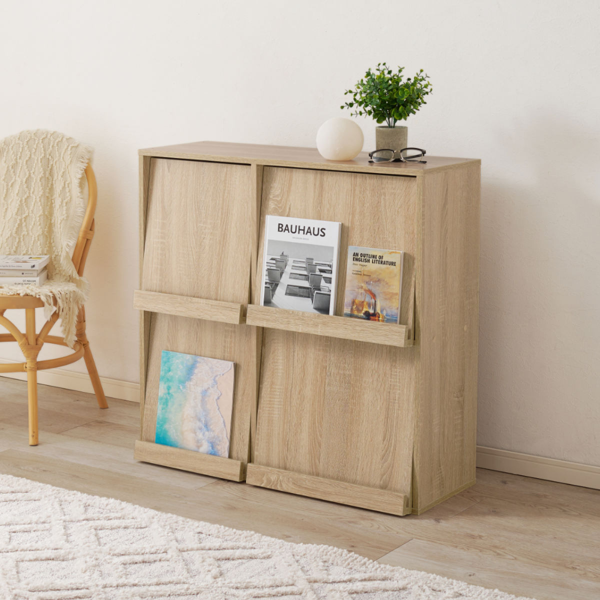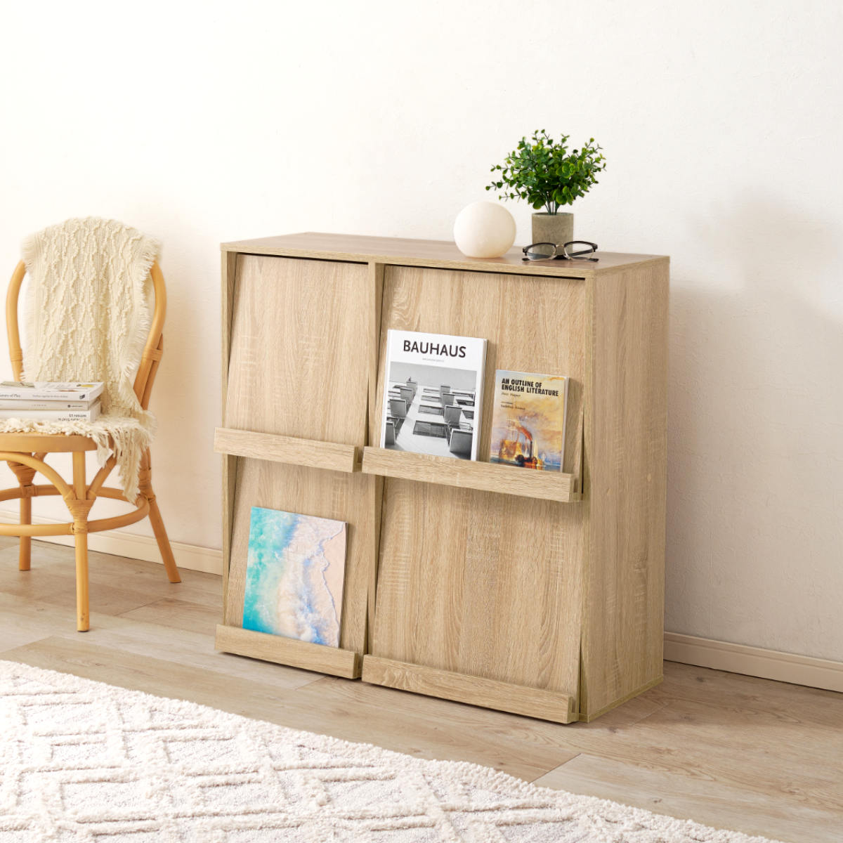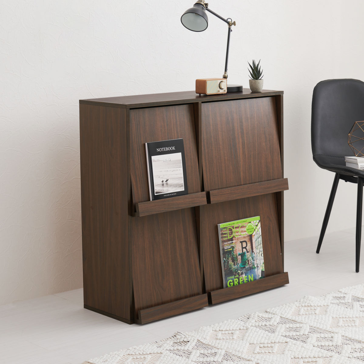 見せたくない物は扉の中に収納しながら、扉にはお気に入りの雑誌を飾れるディスプレイラックです。4つの棚に、本やCD、雑誌や生活雑貨などを用途で分けて収納できます。