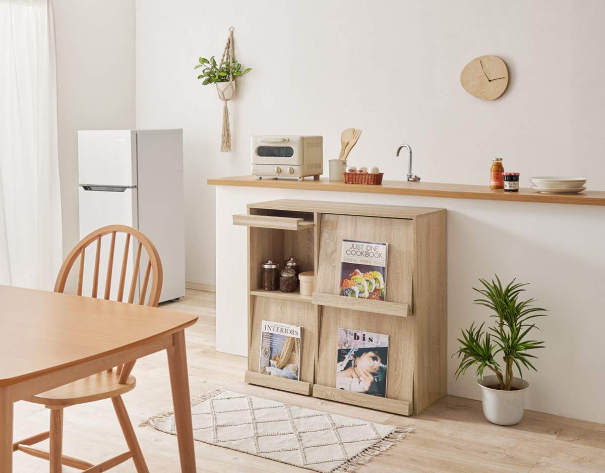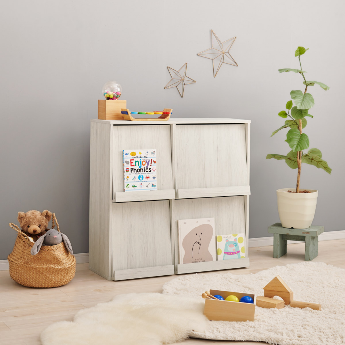 お子さまのおもちゃ収納にも便利です。来客時には、サッとフラップ扉を閉じればお部屋がすっきりとして見えます。ディスプレイ部分には、お子さまの可愛い絵本を飾っておくのがおすすめ。