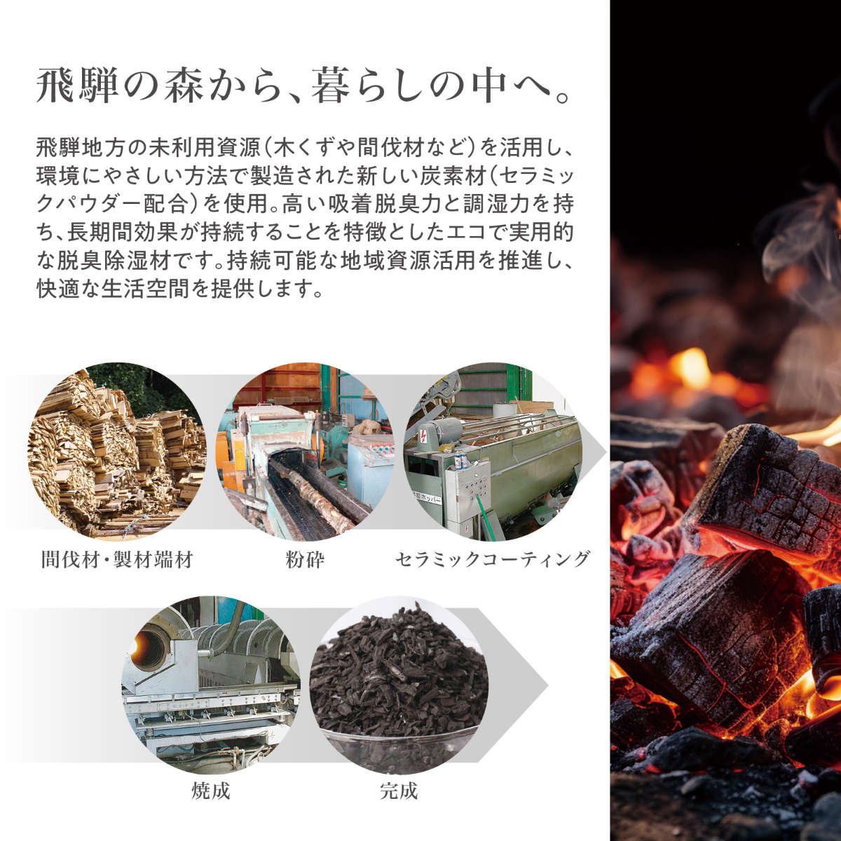 飛騨地方の未利用資源(木くずや間伐材など)を活用し、環境にやさしい方法で製造された新しい炭素材を使用したシューズ用脱臭除湿シートです。高い吸着脱臭力と調湿力を持ち、長期間効果が持続することを特徴としており、エコで実用的です。持続可能な地域資源活用を推進し、快適な生活空間を提供します。