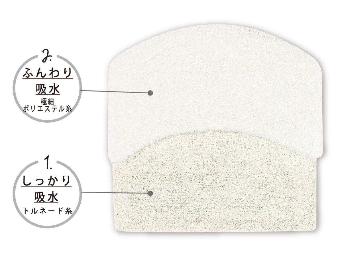 2ステップ吸水で、至福の「さっぱり」「ふわふわ」体験が味わえるバスマットです。しっかり吸水してくれるトルネードマットと、ふんわり足触りが心地良い極細ポリエステル糸マットを、一枚のバスマットとして仕上げました。毎日のバスタイムをより充実させてくれます。