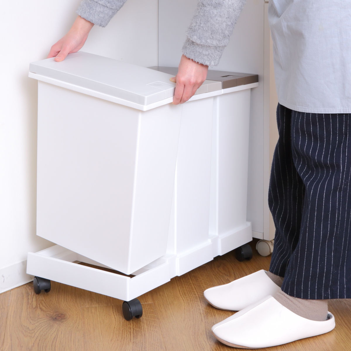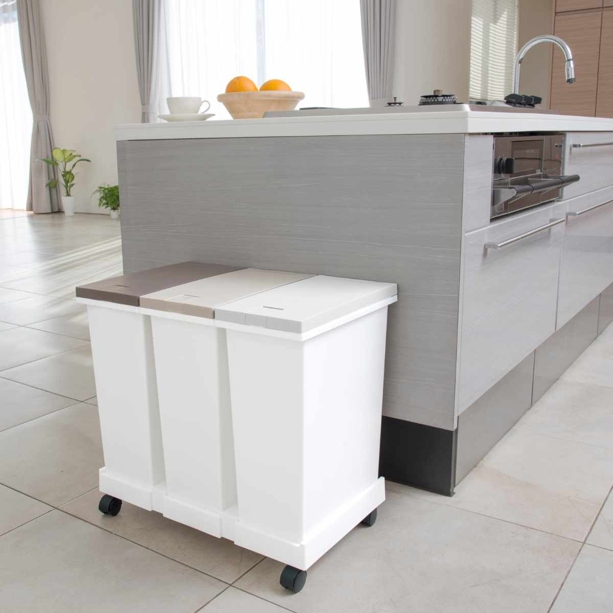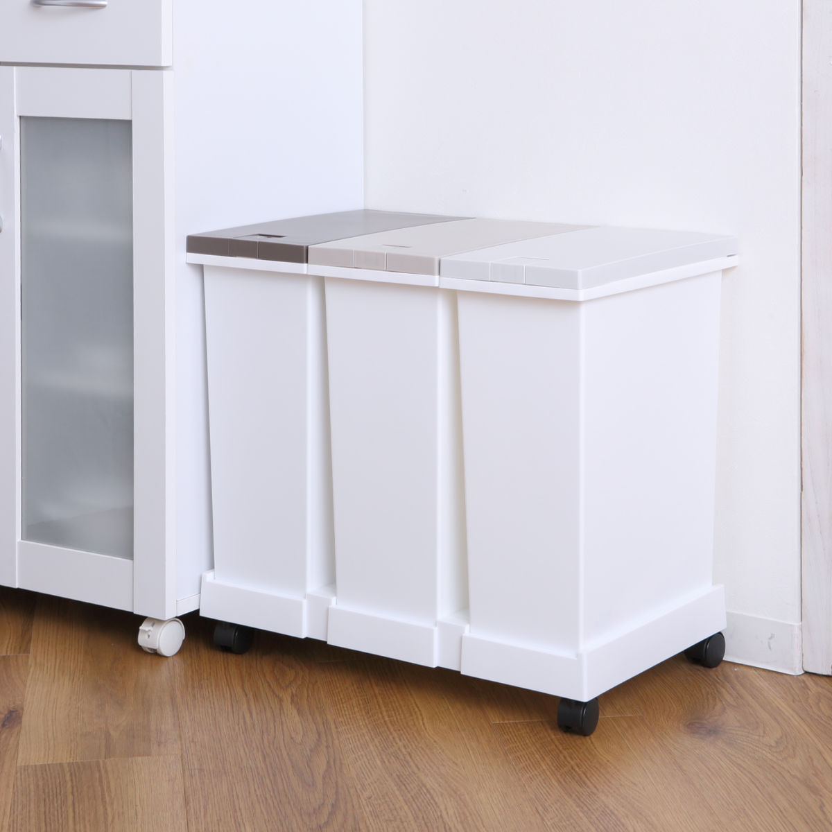 付属のキャスターを取り付ければ、ゴミ箱3個をまとめてスムーズに移動できます。掃除機をかけるときや床掃除の際も、持ち上げる必要がなく便利です。
