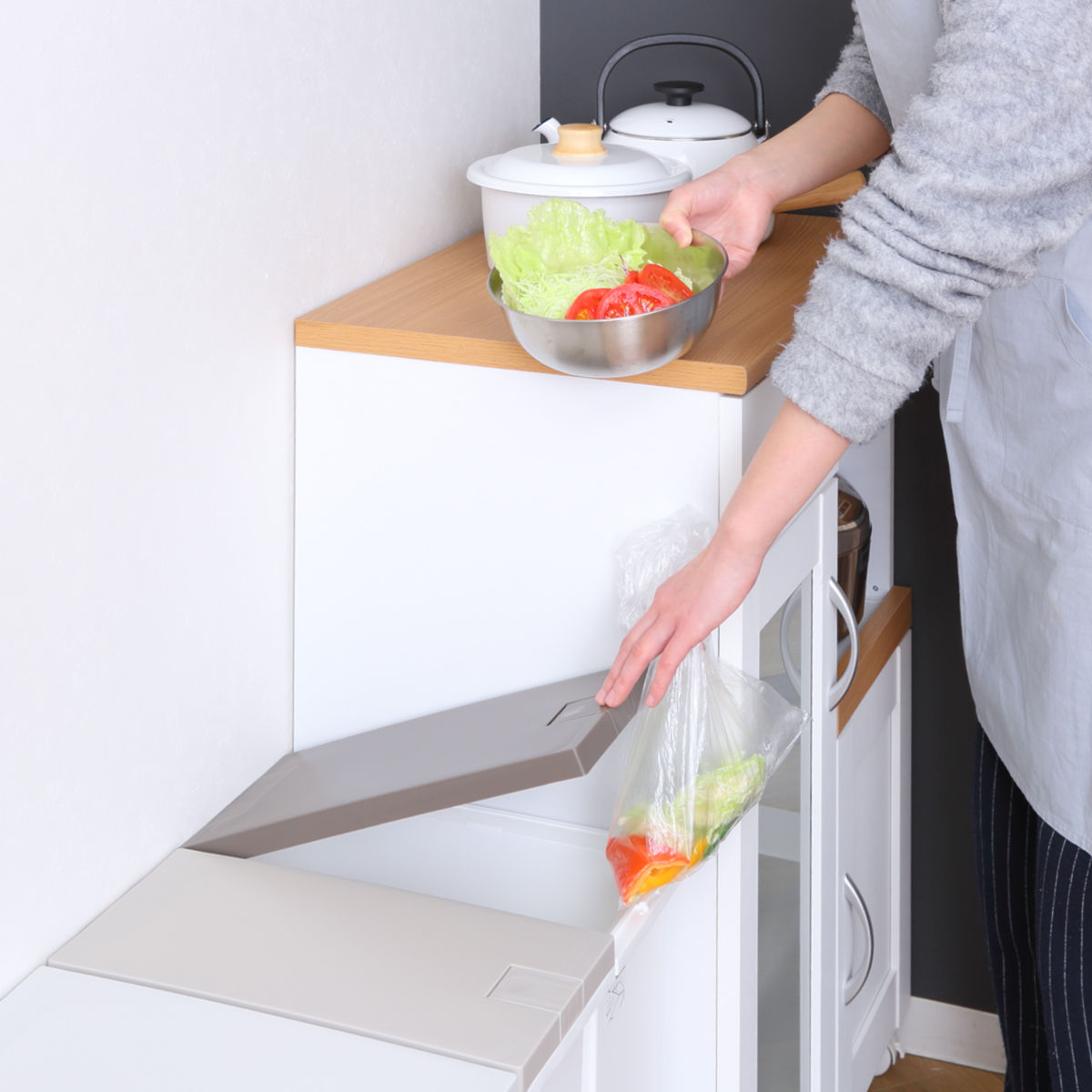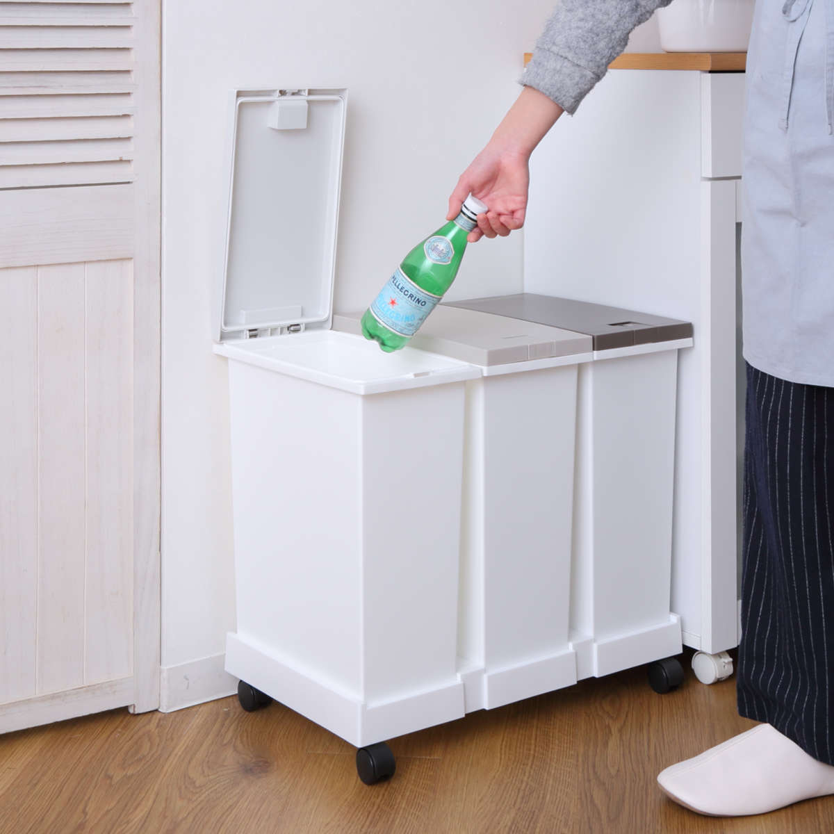 ペットボトル・カン・ビンなどを1台でまとめて分別できます。ゴミ箱をいくつも置く必要がなく、キッチン周りもすっきり。1か所で分別できるのでゴミ捨てがスムーズになり、自然と分別の習慣づけにもつながります。