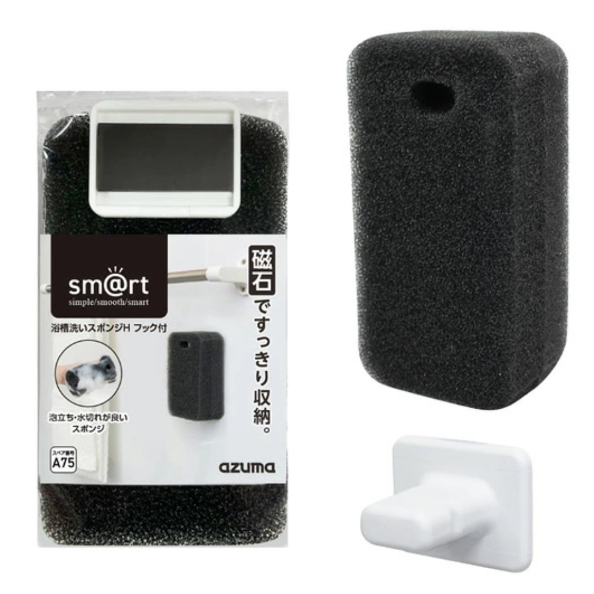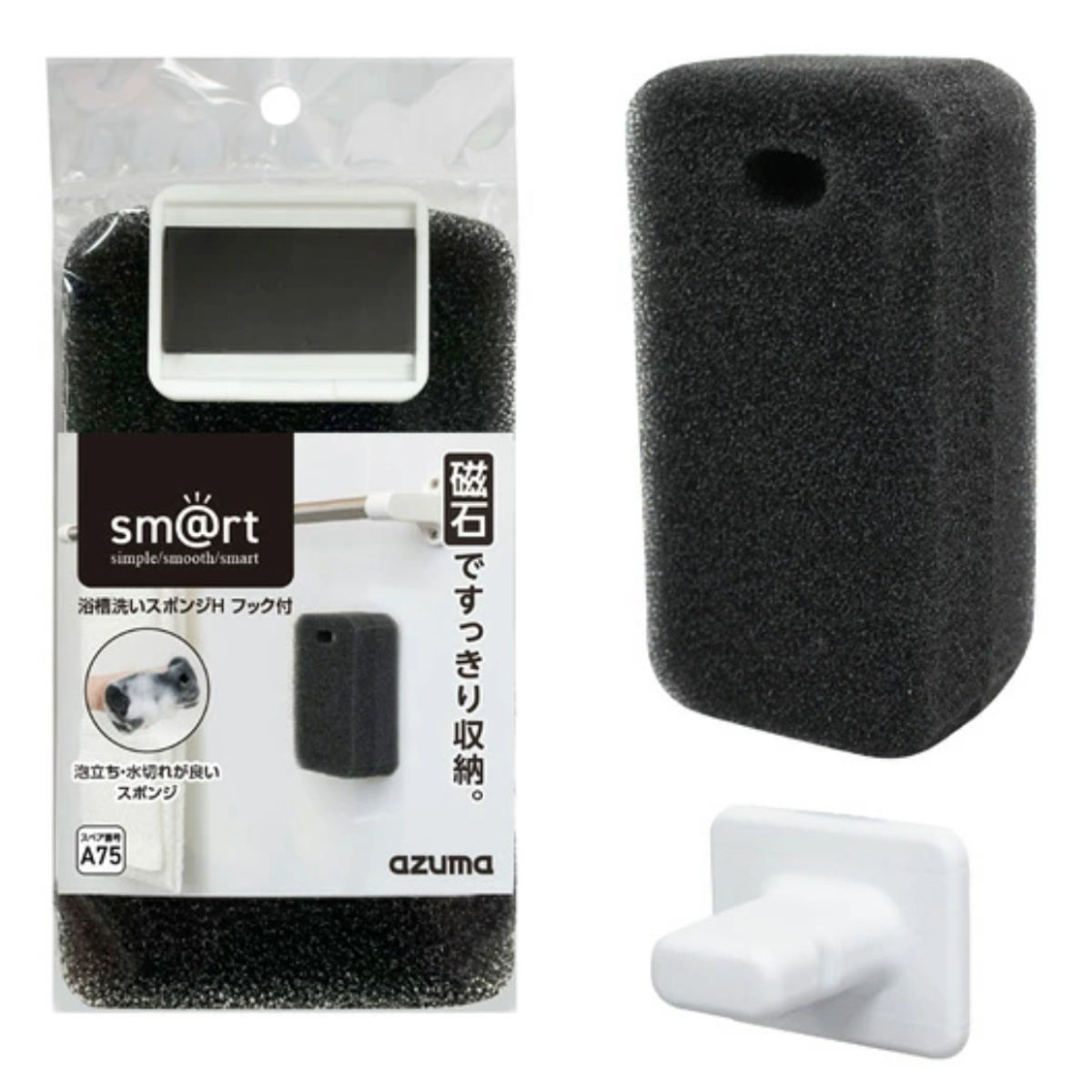浴槽洗い スポンジ フック付き sm@rt649 ( スマート お風呂掃除 バススポンジ シンプル 黒 水切れ 泡立ち 浮かして収納 マグネット 掃除用品 掃除用スポンジ お風呂 掃除 )