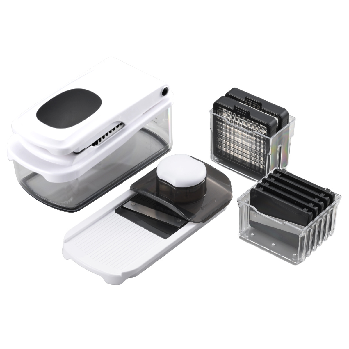●みじん切り(太目・細目)、おろし、スライス(厚切り・薄切り)、ウェーブ、細千切り、しりしり、など8種類のスライサーです。