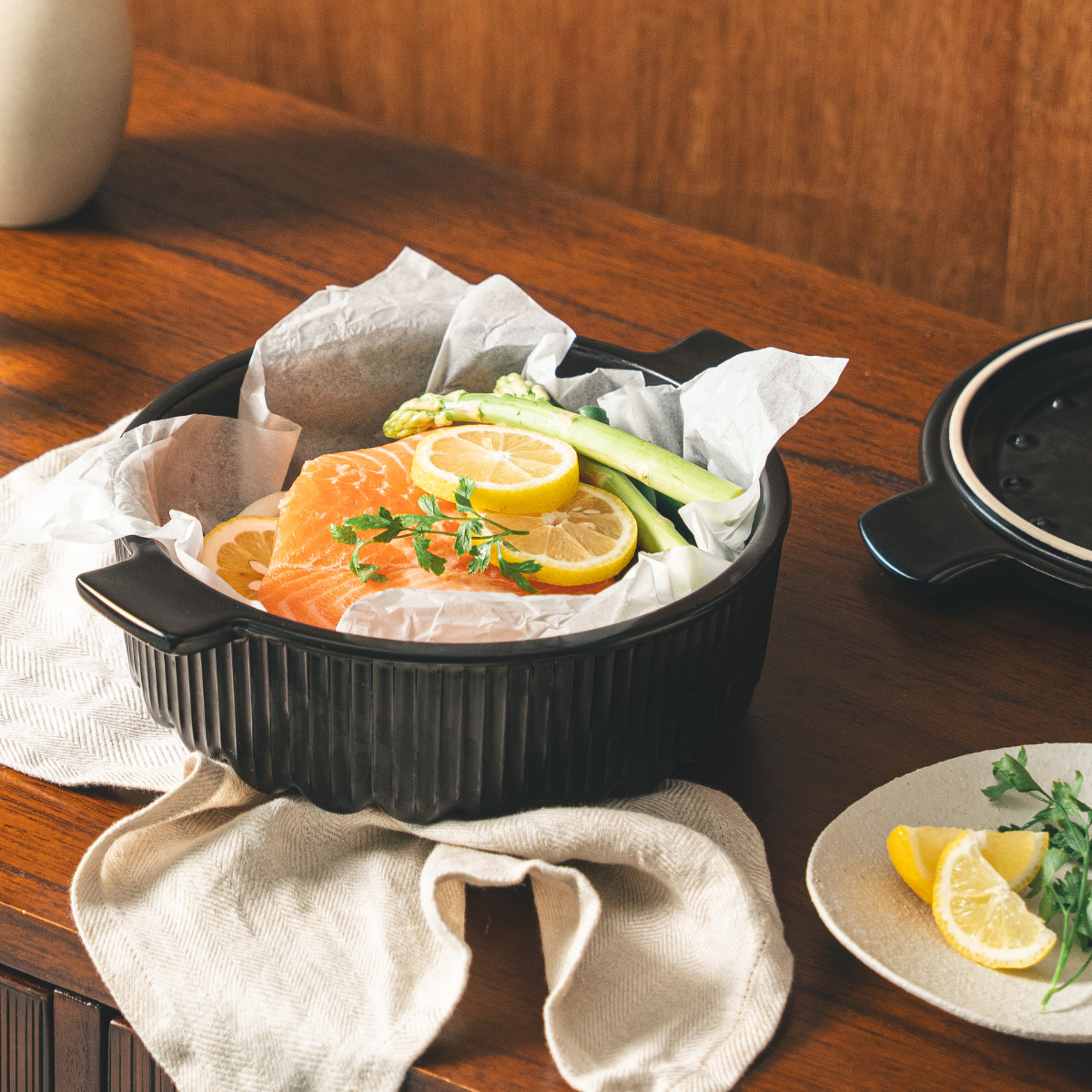 オーブンでも使用可能なため、煮込み料理から焼き料理までお楽しみいただけます。グラタン、クリームリゾット、サーモンパピヨット 、いつものお料理からスペシャルな一品まで、多種多様なお料理まで作れます。