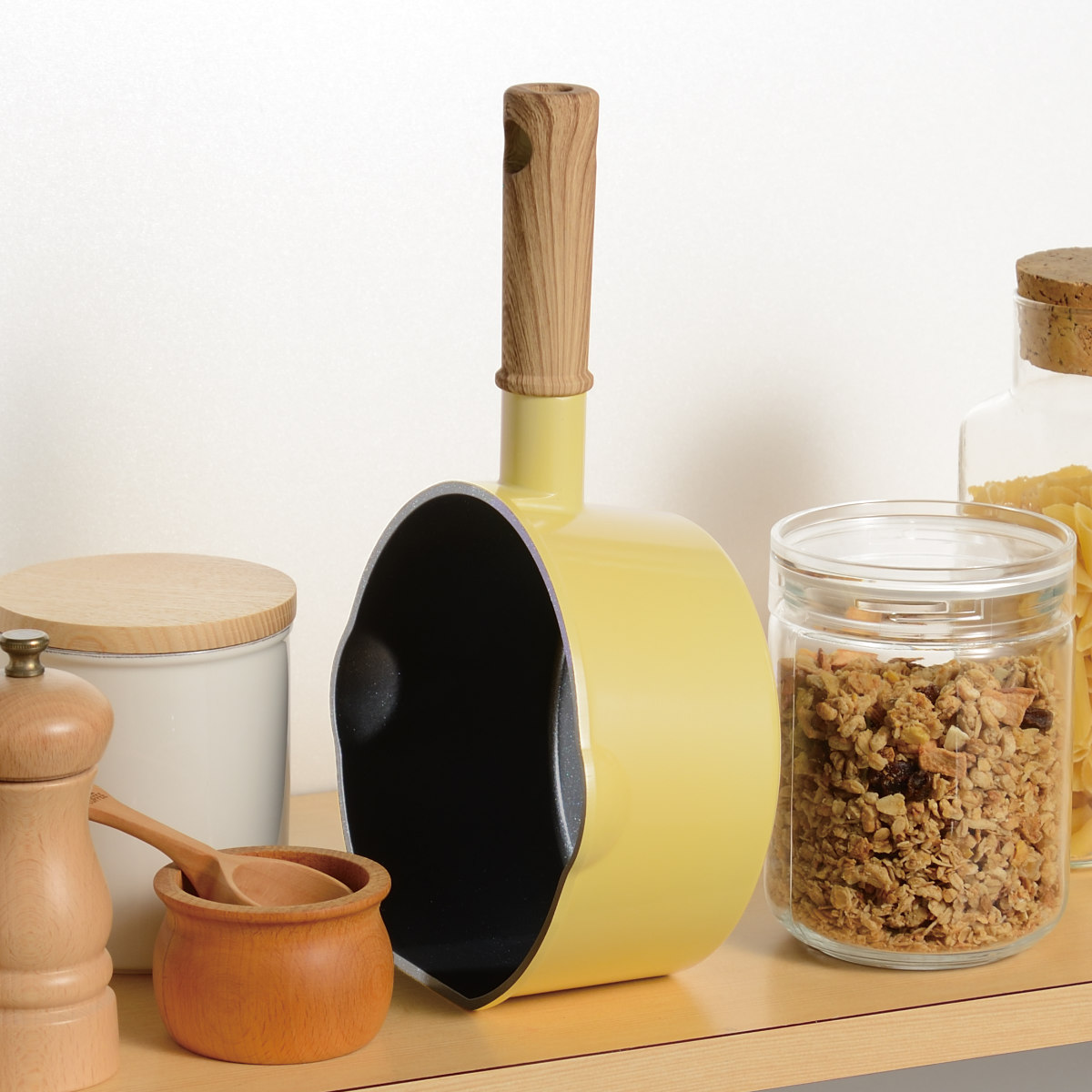フライパン 16cm IH対応 ココミッケ 横置き スタンドパン ( 片手鍋 ミルクパン マルチパン フッ素加工 ガス火対応 調理器具 小鍋 小さい 自立 収納 便利 フッ素樹脂加工 アルミ製 アルミ鍋 木目調ハンドル 可愛い ) 【ミモザイエロー】
