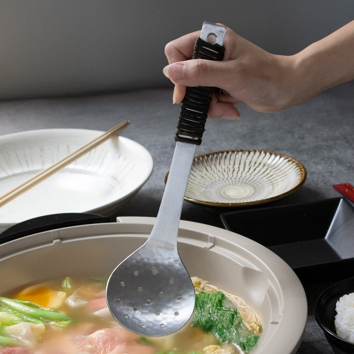 同じシリーズのアケビ巻きお玉を穴無し・穴明きで全部で6種類ご用意しております。軽くて丈夫なアルミシリーズは、キッチンはもちろん卓上での使い勝手も抜群。気付くと手に取っている、そんな愛用品になるかもしれません。