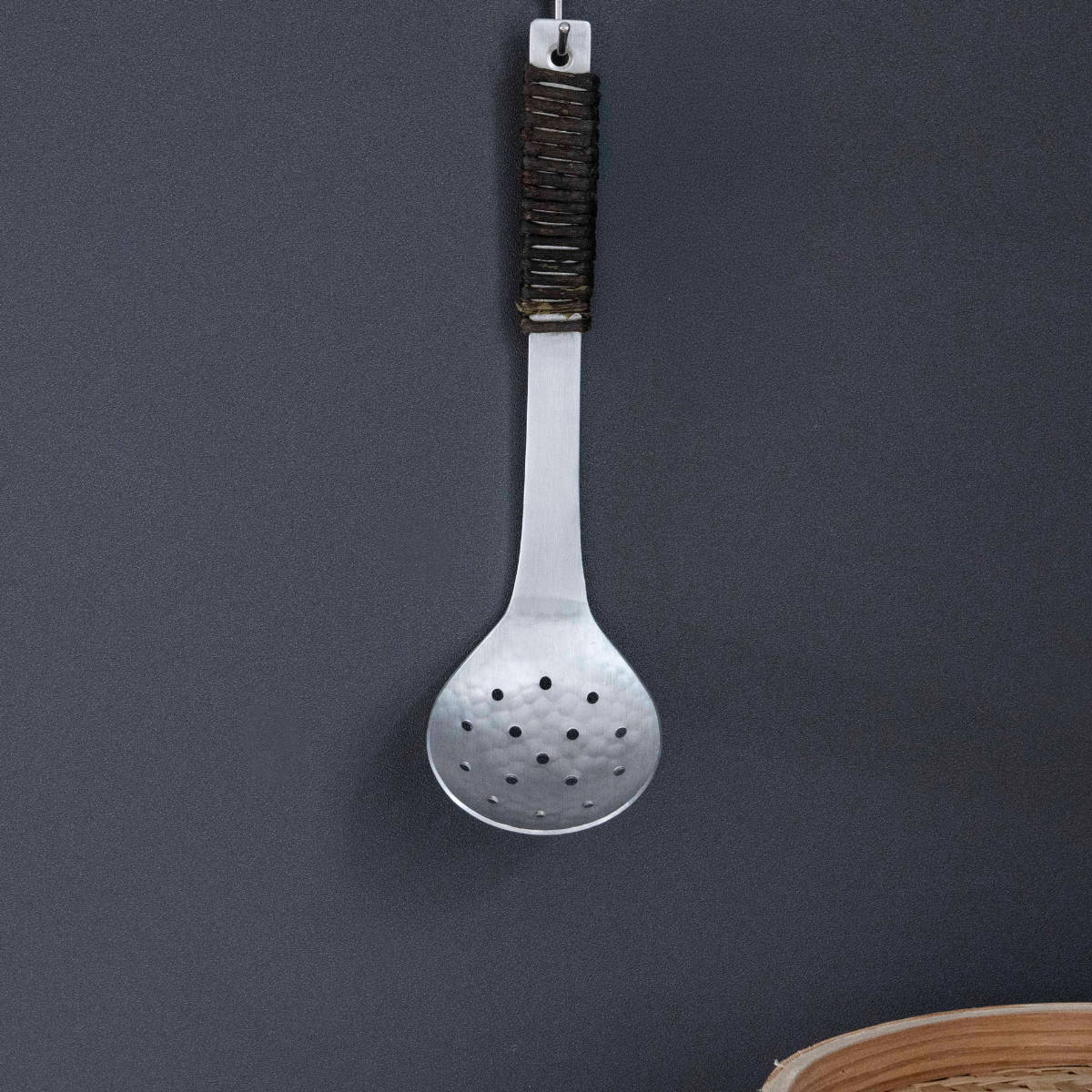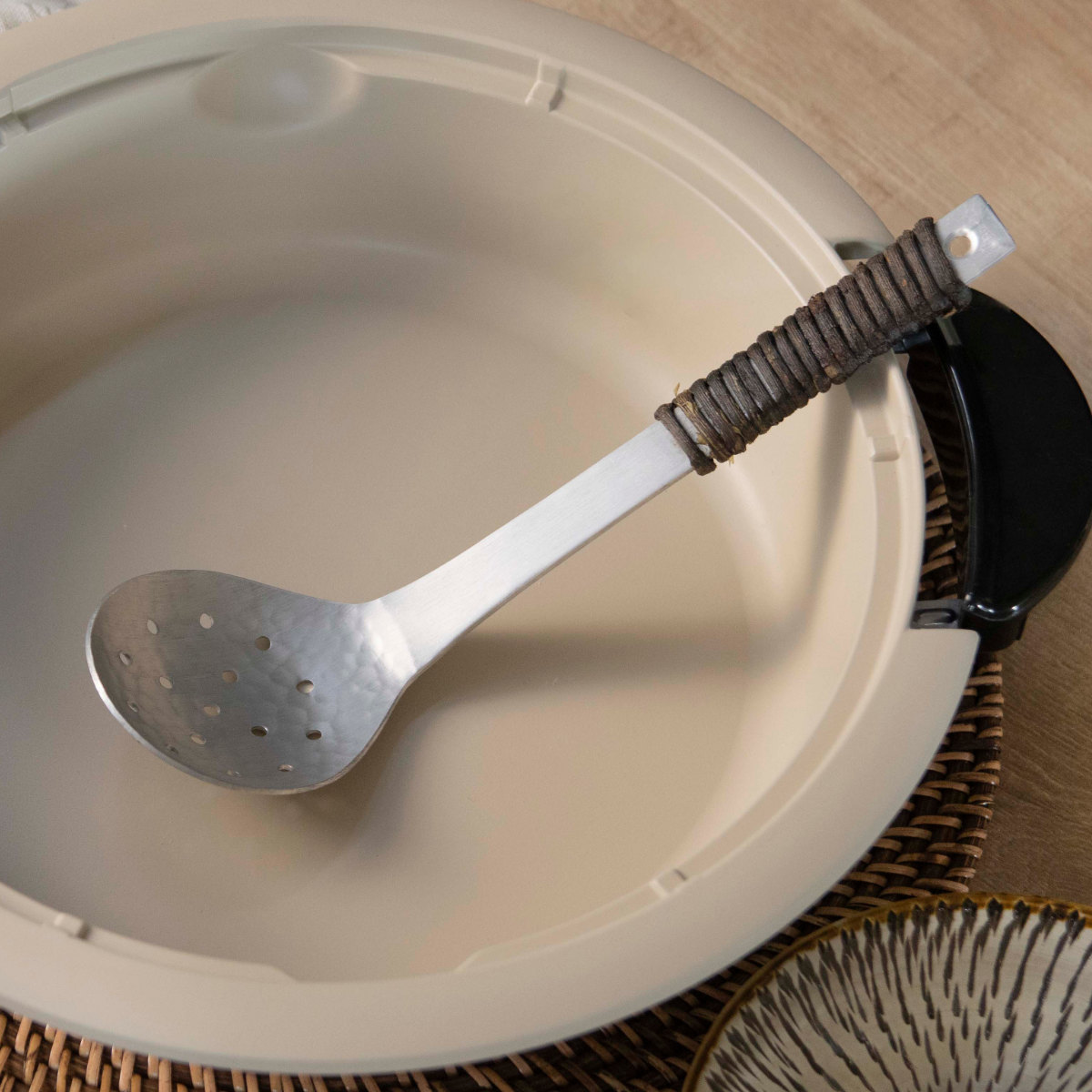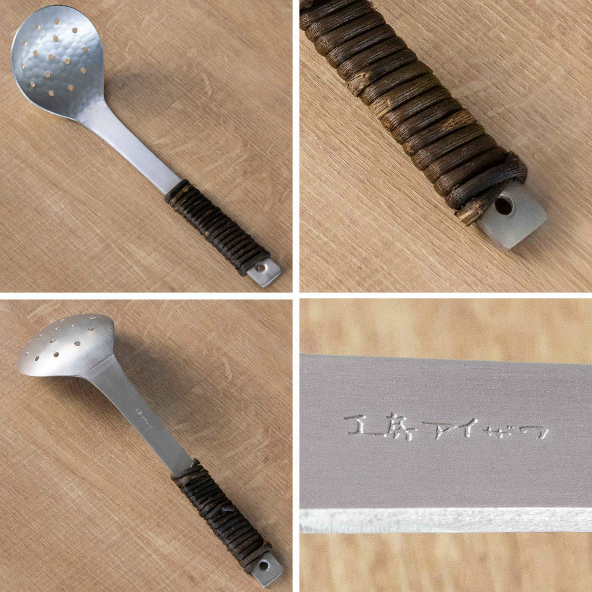 柄の部分には、しなやかで丈夫なアケビのツルが丹念に一つ一つ巻き付けられています。アケビ巻きは、使う人の手に優しく馴染み、熱くなりにくいのが特徴です。濡れても滑りにくく、「熱いものも安心してすくえる」という、機能性への細やかな配慮が込められています。