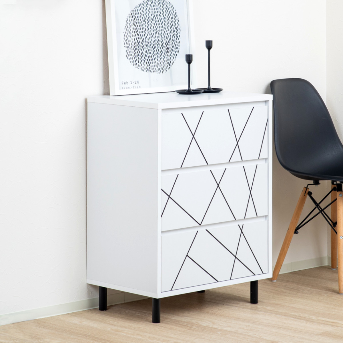 お部屋に取り入れやすい白×黒の幾何学模様がアクセントになっています。脚付きのスッキリとしたデザインなので、空間を広く見せてくれます。デザイン性と、開閉スムーズな引出しなど実用性も持ち合わせた収納家具です。