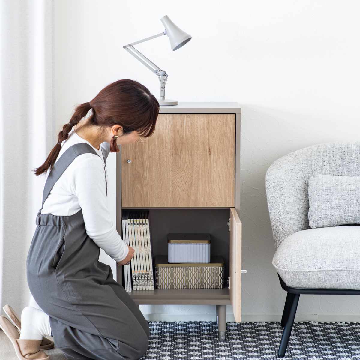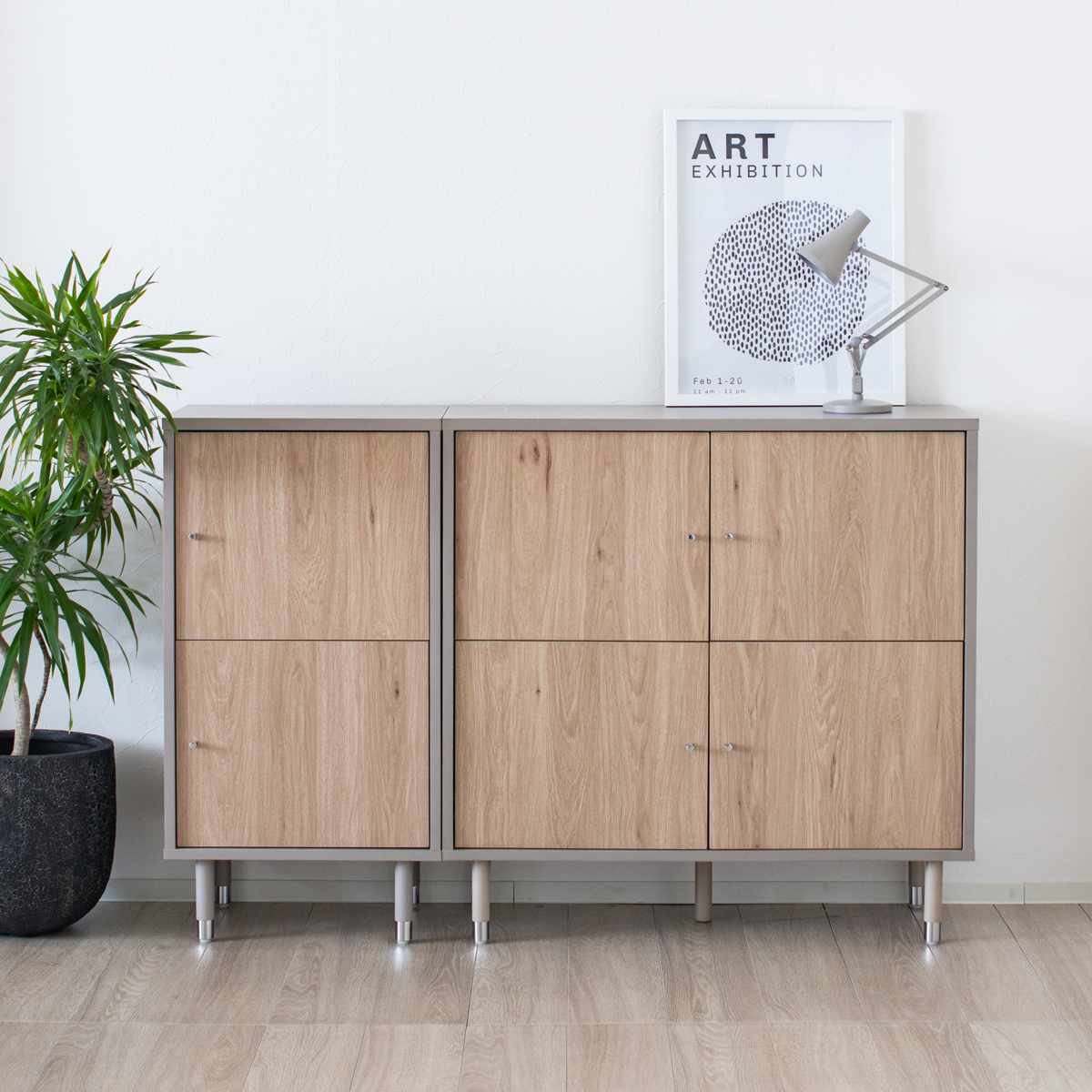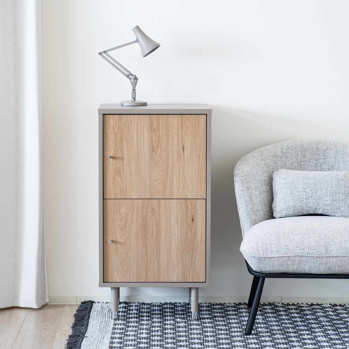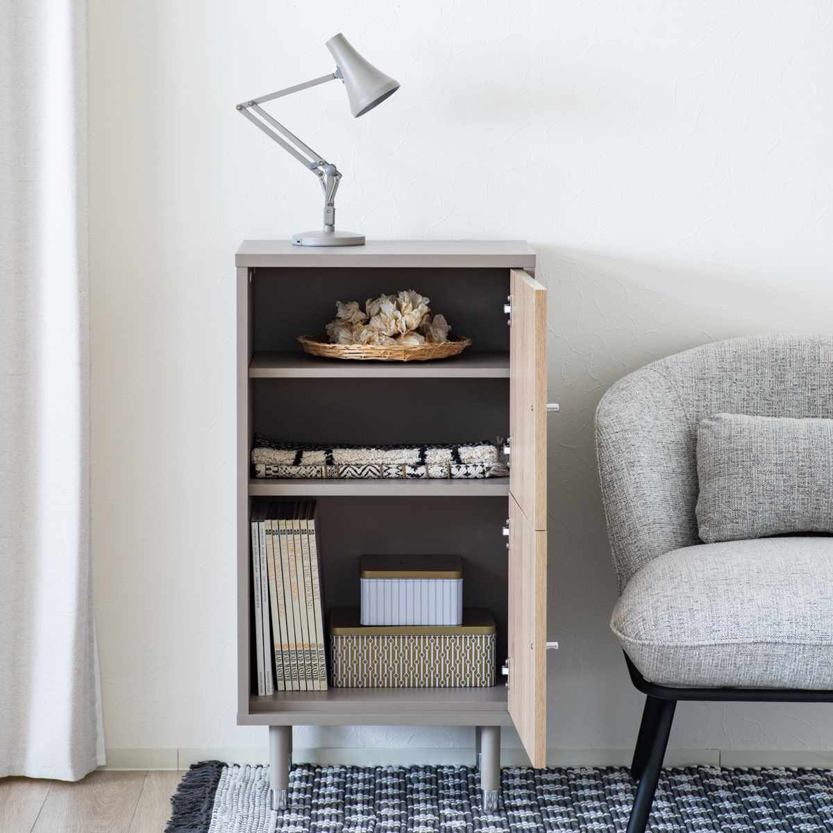 ナチュラルな空間にもモダンな空間にも馴染む「シュランク」シリーズのキャビネットです。やわらかなグレージュとナチュラルな木目柄の組み合わせが、お部屋に温もりと上品さをプラス。シルバーの取っ手と脚がさりげないアクセントになっています。