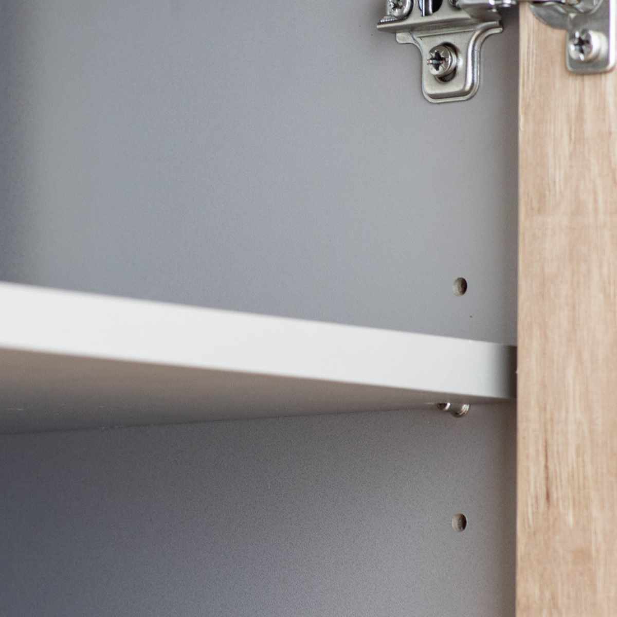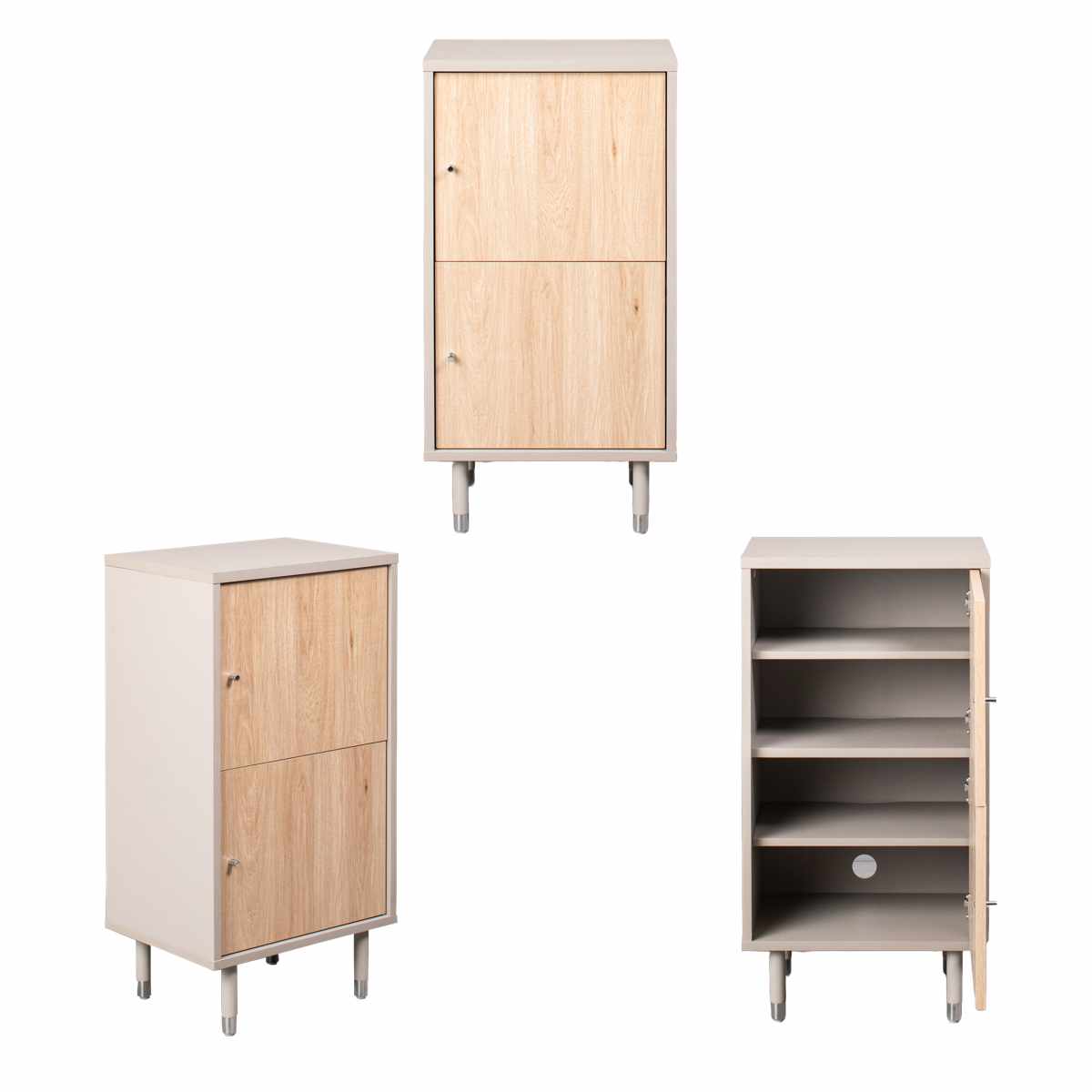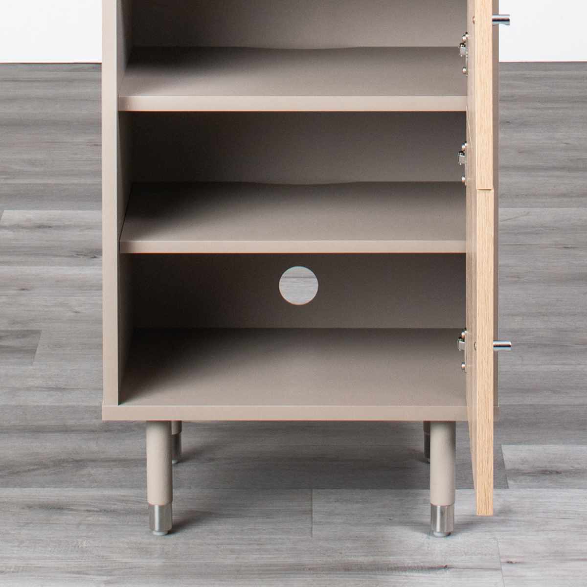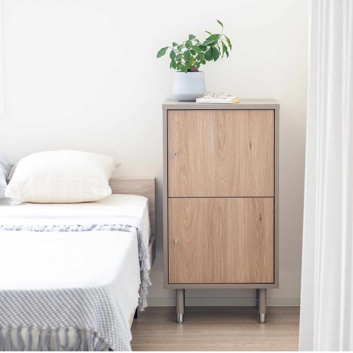 ナチュラルな空間にもモダンな空間にも馴染む「シュランク」シリーズのキャビネットです。やわらかなグレージュとナチュラルな木目柄の組み合わせが、お部屋に温もりと上品さをプラス。シルバーの取っ手と脚がさりげないアクセントになっています。