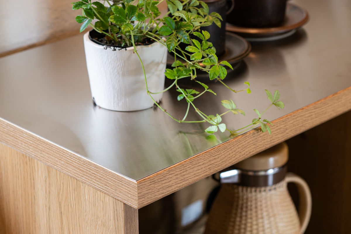 組み合わせできるキッチン収納専用の天板です。耐熱性があり、熱いお鍋などを置くことができるステンレス製です。