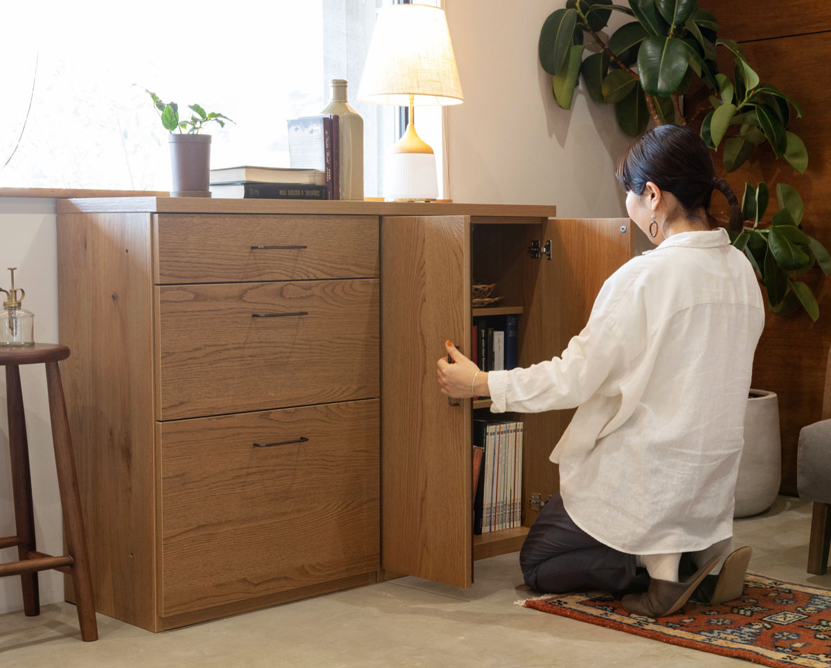 | 材質 | 前板:オーク突板、オイル仕上げ 側面、背面:プリント 取っ手:真鍮 |