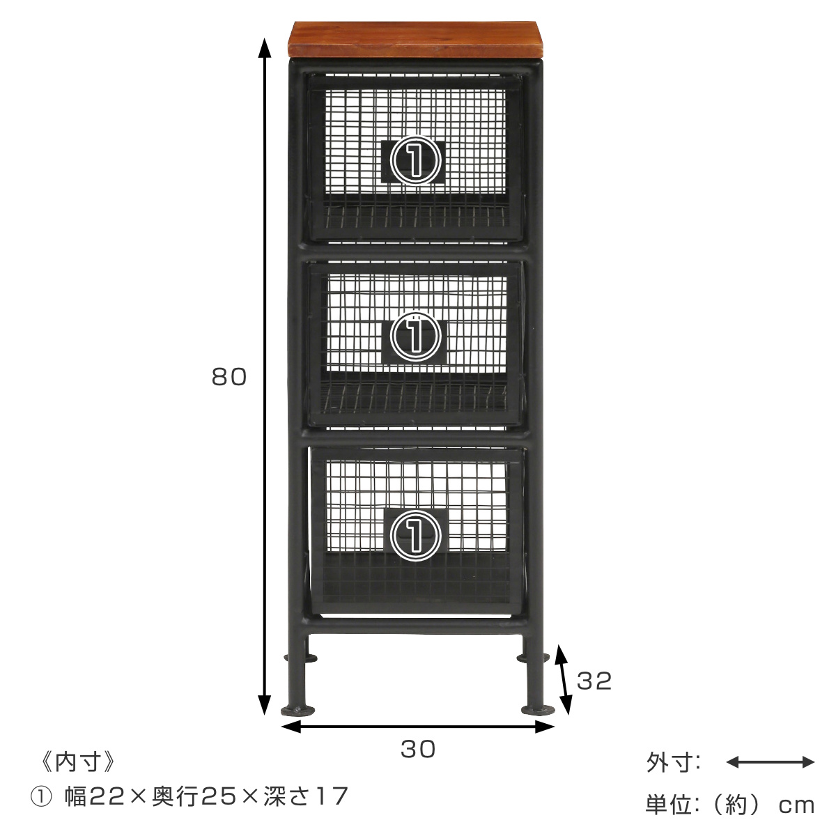 スチールメッシュ スリムチェスト 幅30cm 引出し3杯 木天板 完成品 ( チェスト スチール 引き出し 3杯 木製天板 棚 ラック 飾り棚 カゴ メッシュ ブラック )