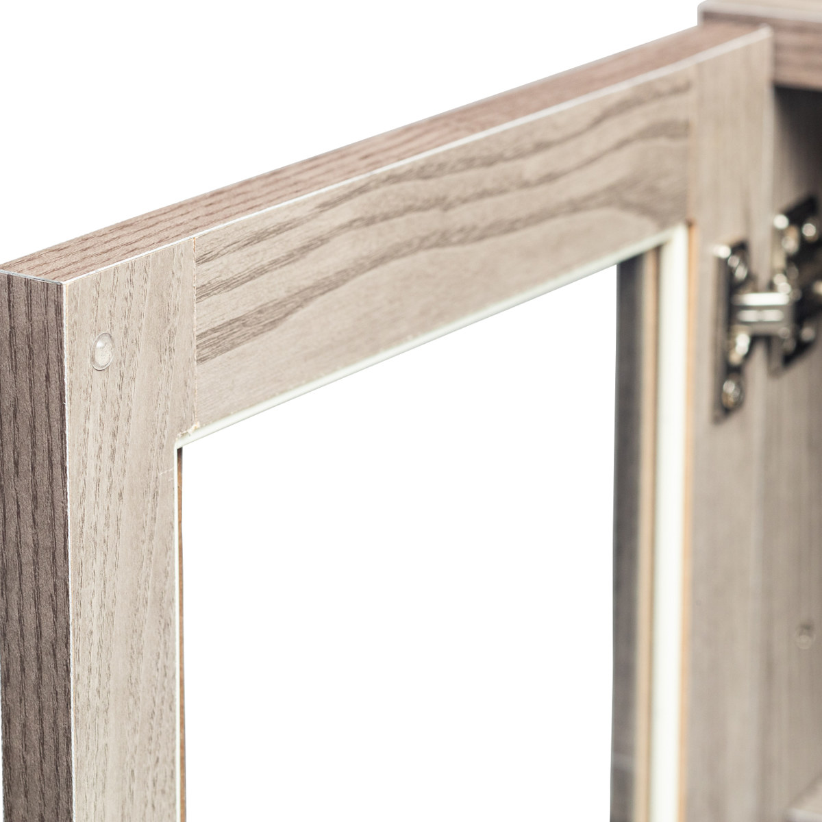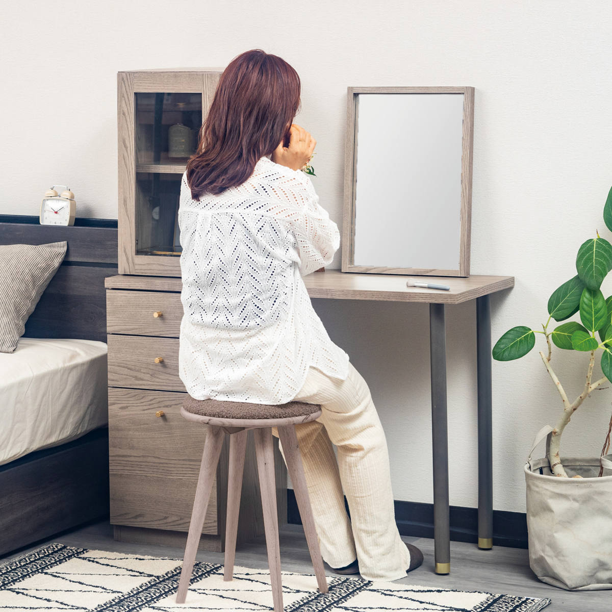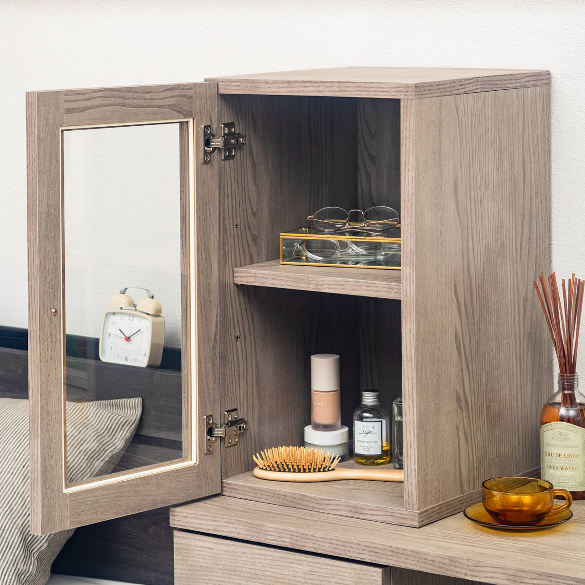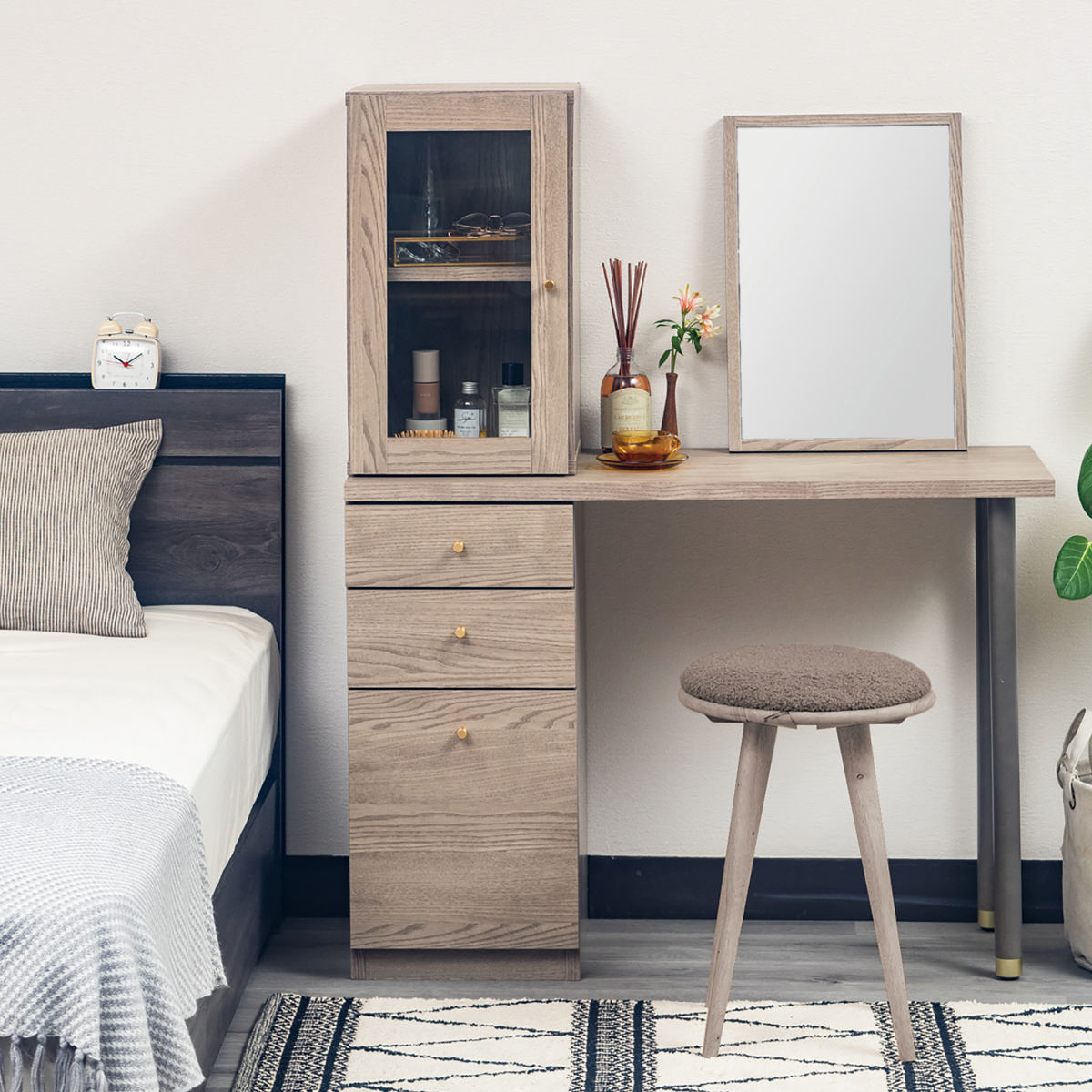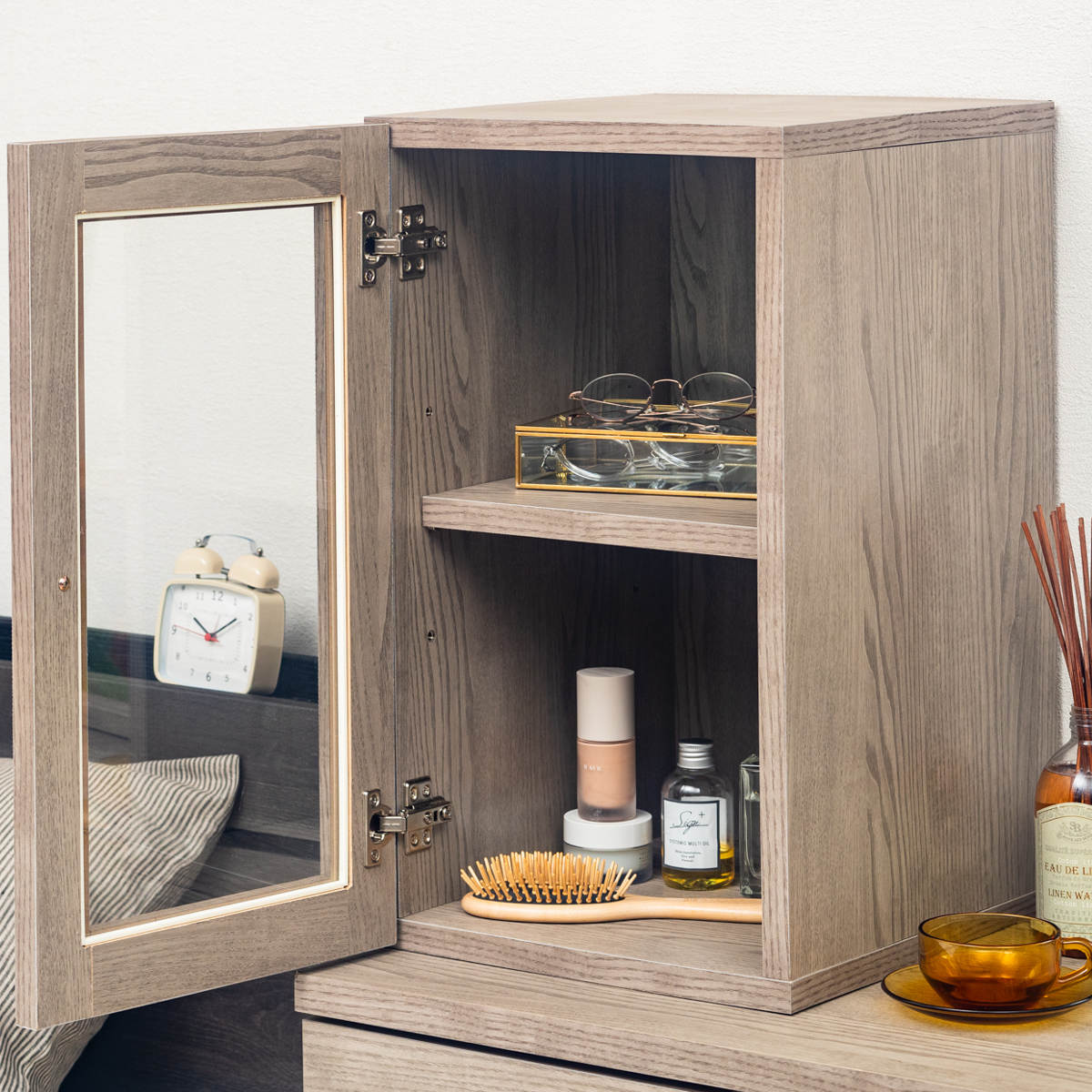 お気に入りのミラーをセットして、ガラスキャビネットにコスメや小物を入れてドレッサーとして使うことができます。