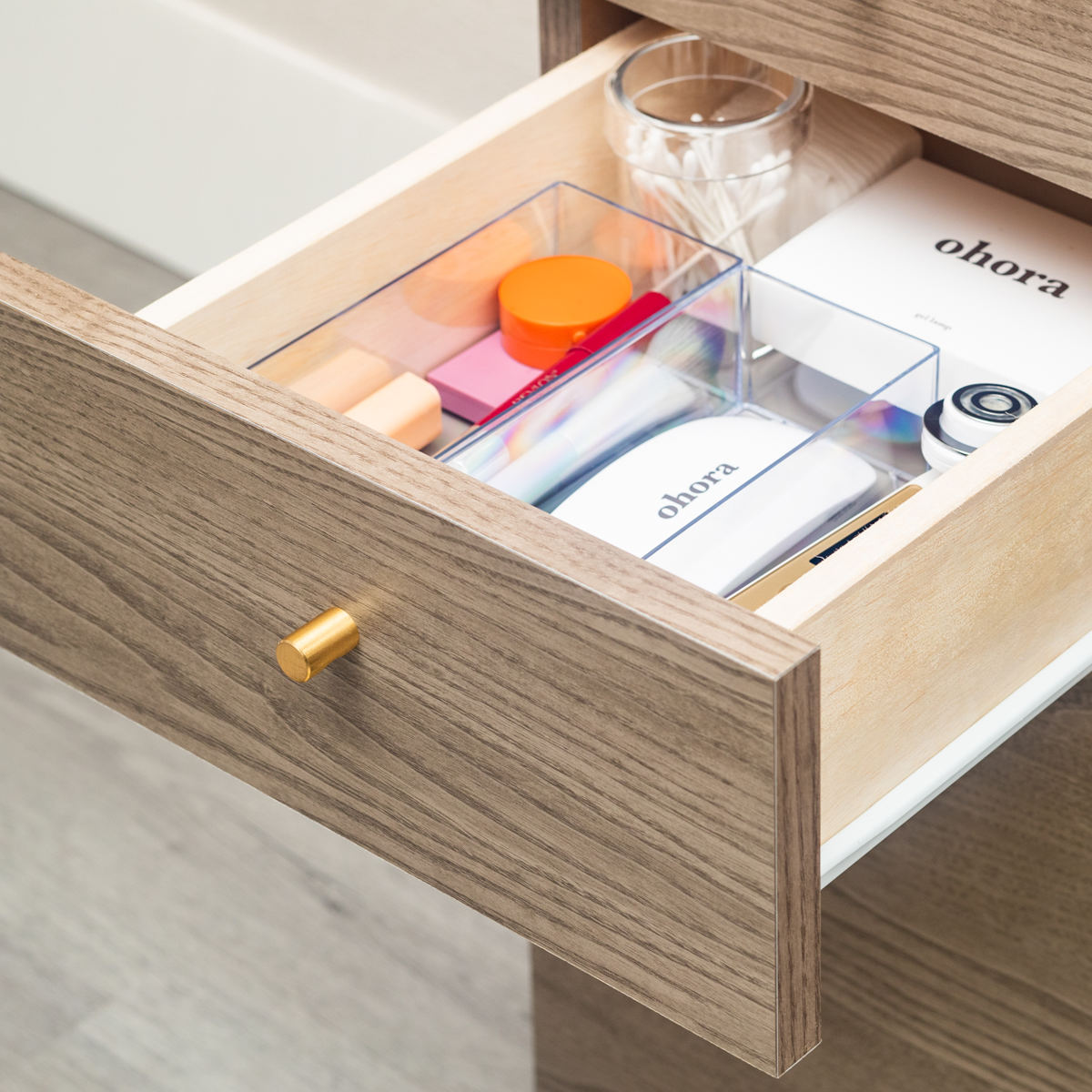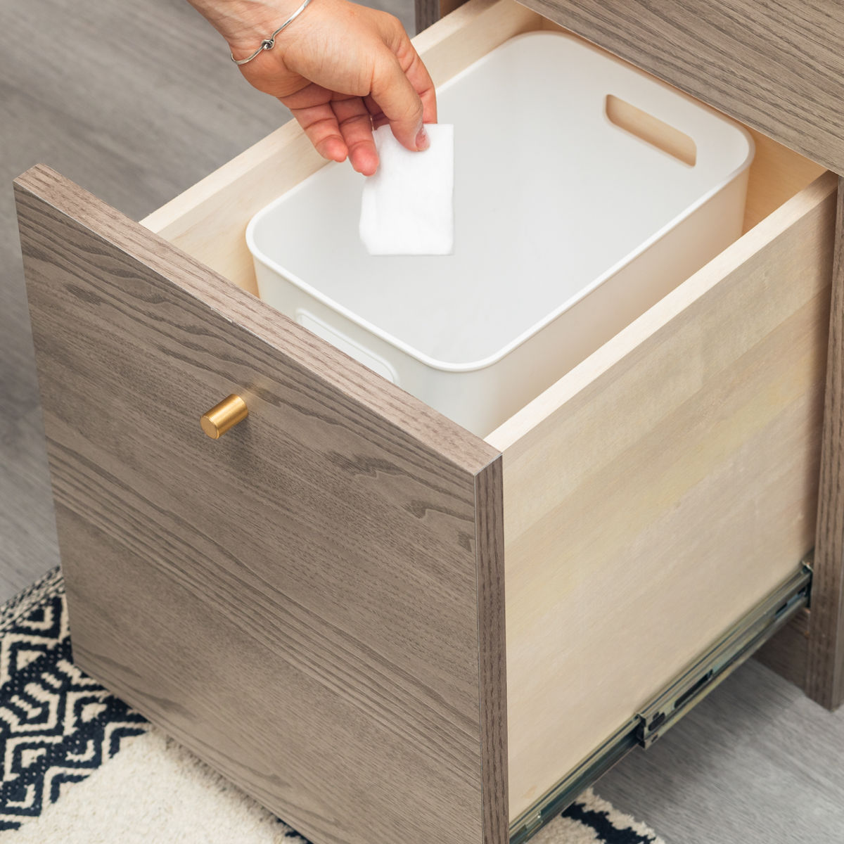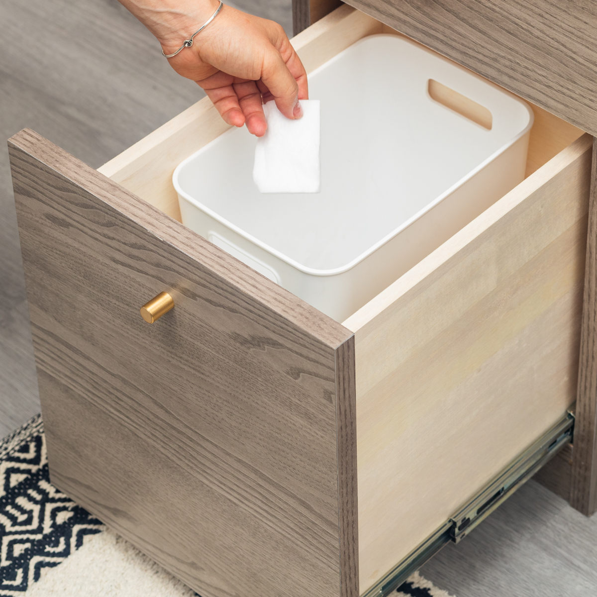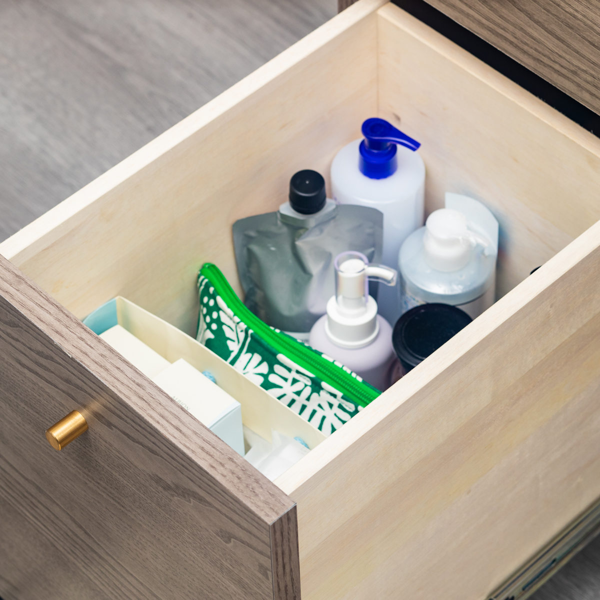 一番下の引出しは深めです。大きめのボトルやスプレー類はもちろん、ゴミ箱を収納するとお部屋がすっきりします。